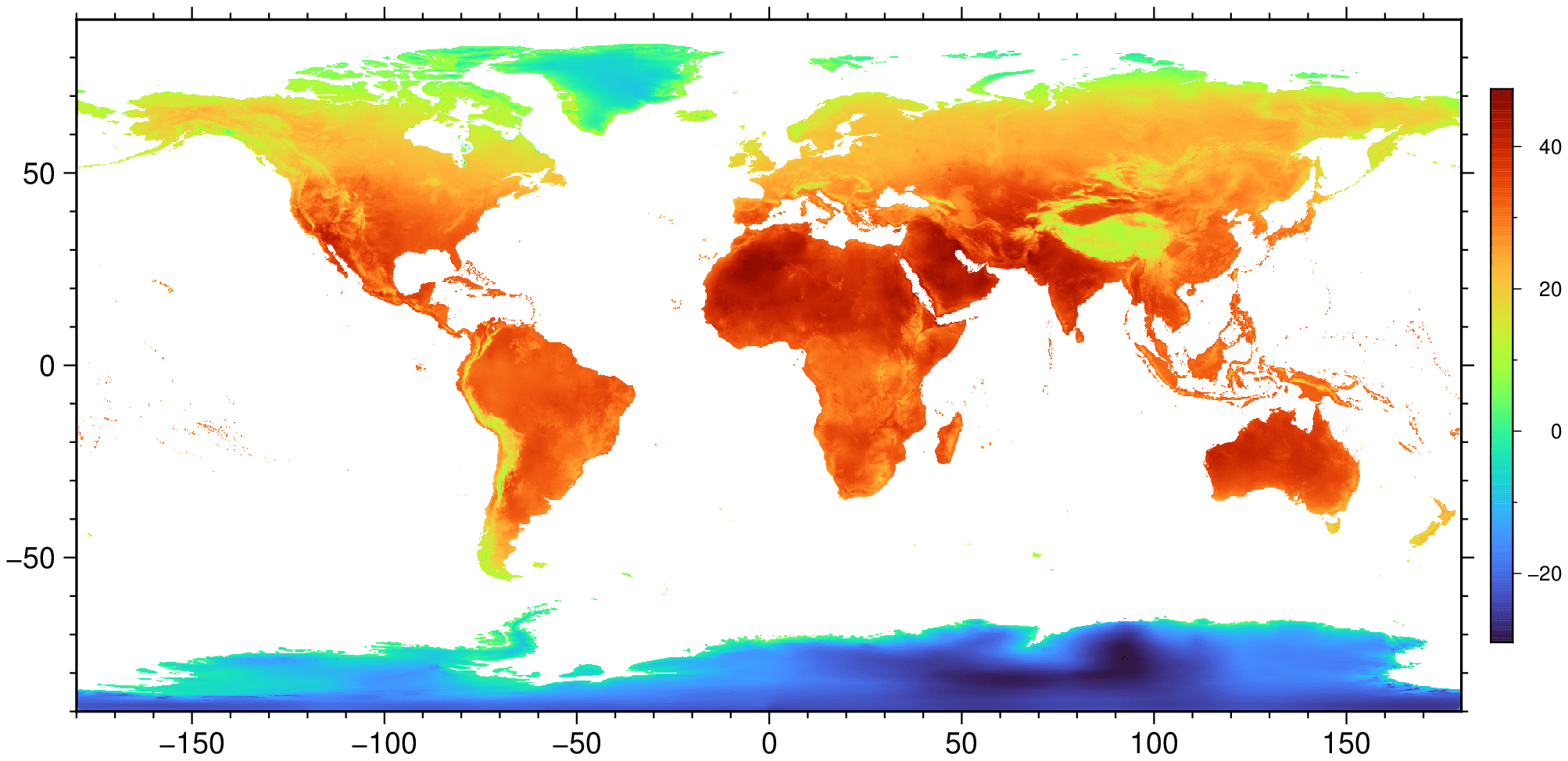 Though many of the use cases shown could be reproduced by GMT.jl directly (it also reads netCDF and multi-layred files) the Rasters.jl package is able to keep some metadata (namely the time axis) and lazy reading of large files that GMT is not yet able to match. Here we will reproduce some of the examples from this Rasters.jl docs.
