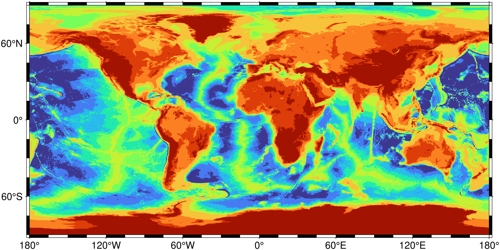 Some of the GMT master dynamic CPTs are actually two separate CPTs meeting at a hinge. Usually, colors may change dramatically across the hinge, which is used to separate two different domains (e.g., land and ocean across the shoreline, for instance). CPTs with a hinge will have their two parts stretched to the required range separately, i.e., the bottom part up to the hinge will be stretched independently of the part from the hinge to the top, according to the prescribed new range. Hinges are either hard or soft. Soft hinges must be activated by appending +h[hinge] to the CPT name. If the selected range does not include an activated soft or hard hinge then we only resample colors from the half of the CPT that pertains to the range. See Of Colors and Color Legends for more information.