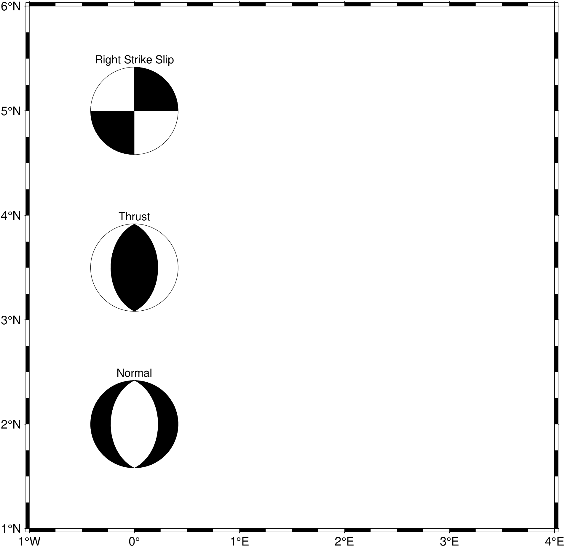 meca(D, region=(-1,4,1,6), proj=:Mercator, aki=2.5, fill=:black, show=true)