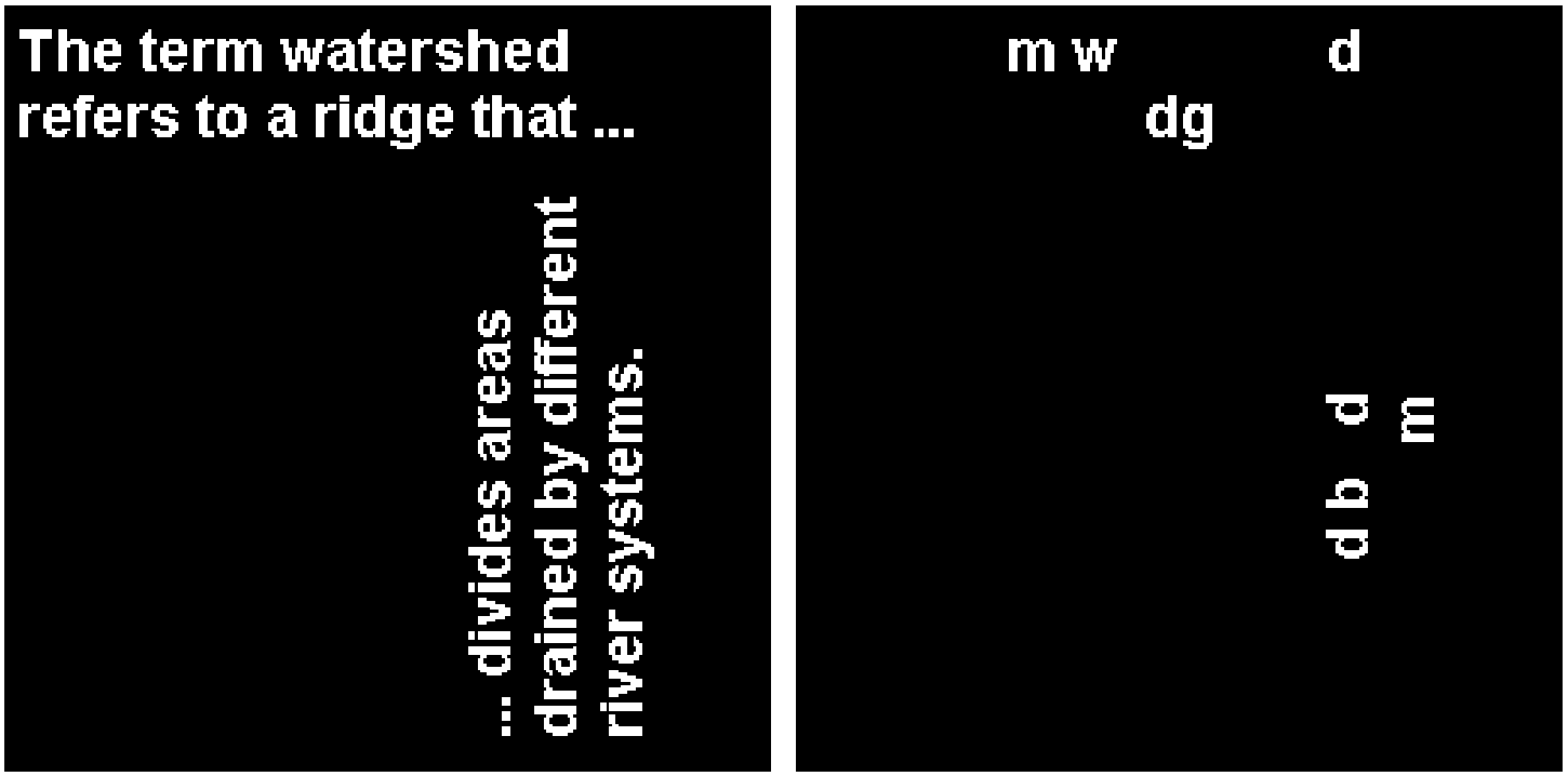 usingGMTI =gmtread(TESTSDIR *"assets/text.png"); # HideCC =bwconncomp(I); # Hide# Sort by area in descending orderidx =sortperm(CC.area, rev=true);Ifilt =cc2bw(CC, obj2keep=idx[2:10])grdimage(I, figsize=6)grdimage!(Ifilt, figsize=6, xshift=6.2, show=true)
