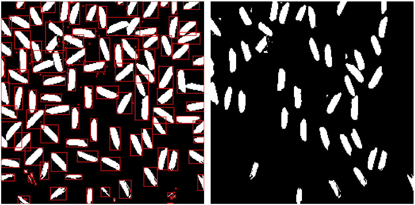 This example also shows a problem with the bwconncomp function when the BoundingBoxes of components overlap. In such cases it may happen that parts of one component are included in the another component. This can lead to wrong results in some areas (as can be seen with the help of the red rectangles drawn around each component).
