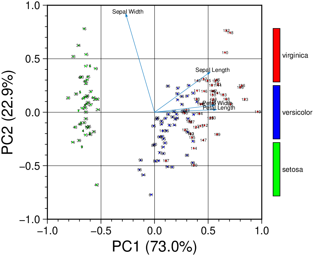 Create a 2D biplot of the Principal Component Analysis (PCA) of a two-dimensional chart that represents the relationship between the rows and columns of a table.