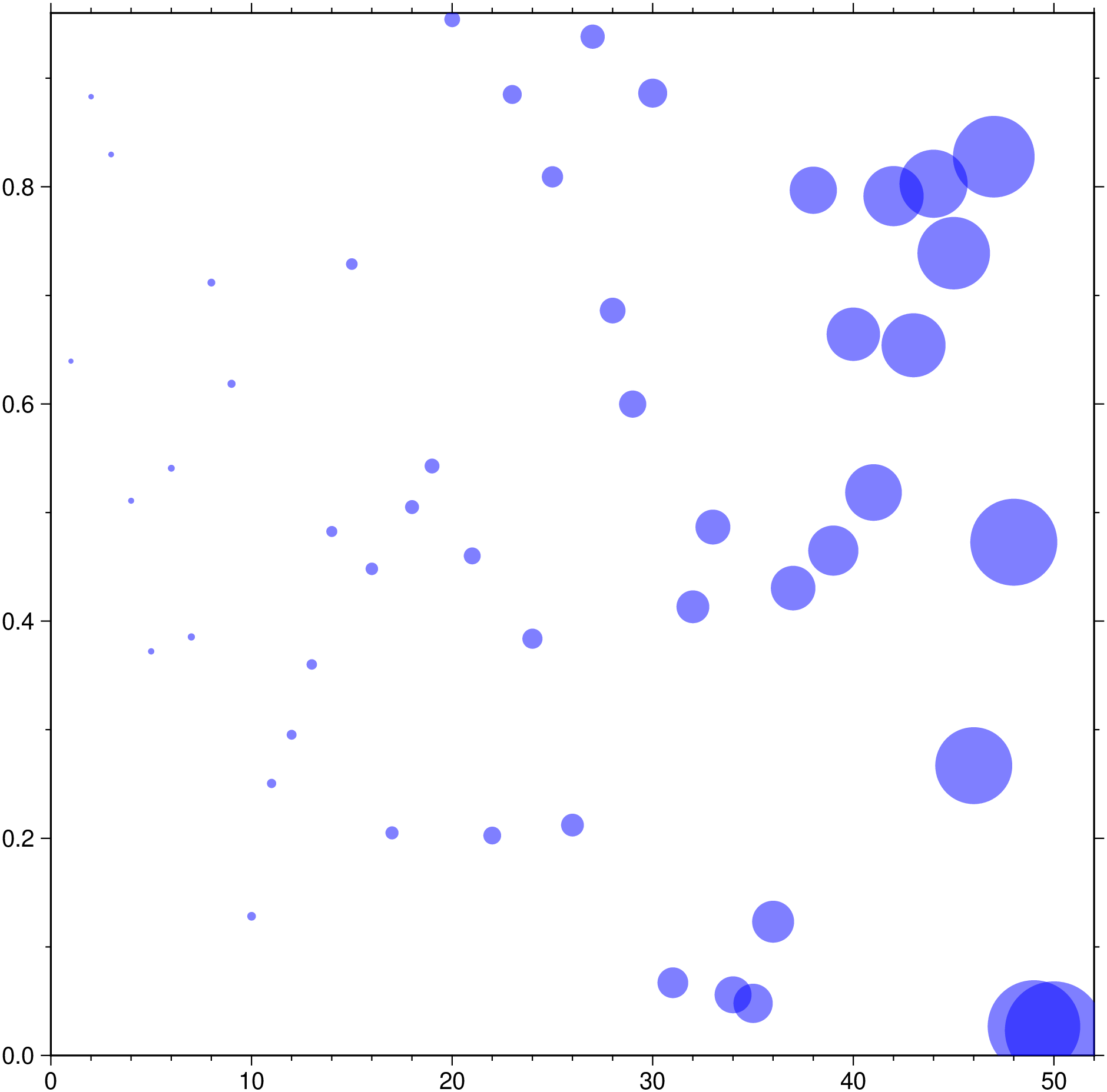 bubblechart(1:50,rand(50), size=rand(50), fill=:blue, alpha=50, aspect="1:1", show=1)