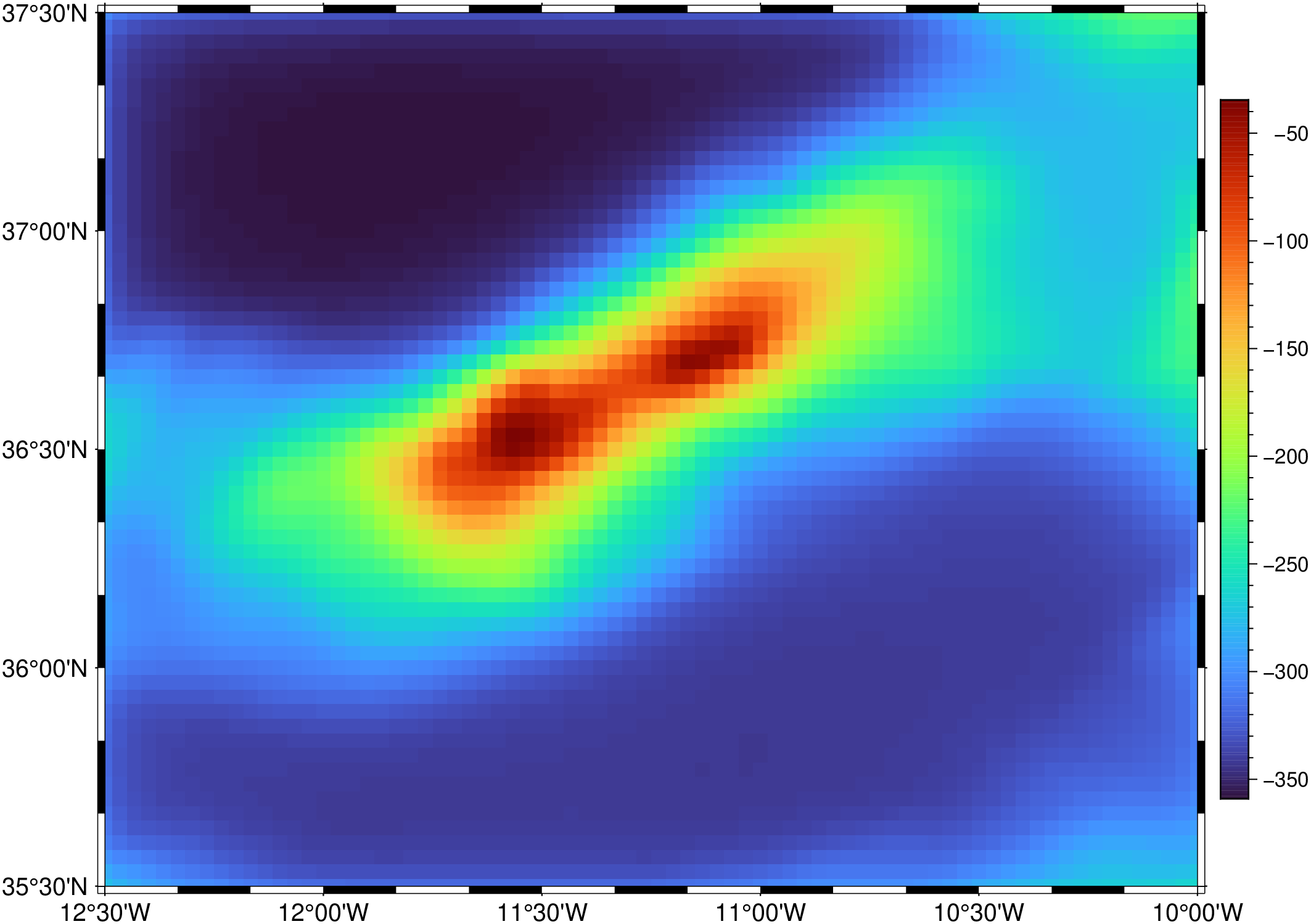 Now subtract it from your free-air anomaly faa.grd and you will get the Bouguer anomaly. You may wonder why we are subtracting and not adding. After all the Bouguer anomaly pretends to correct the mass deficiency presented by the water layer, so we should add because water is less dense than the rocks below. The answer relies on the way gravity effects are computed by the Parker’s method and practical aspects of using the FFT.
