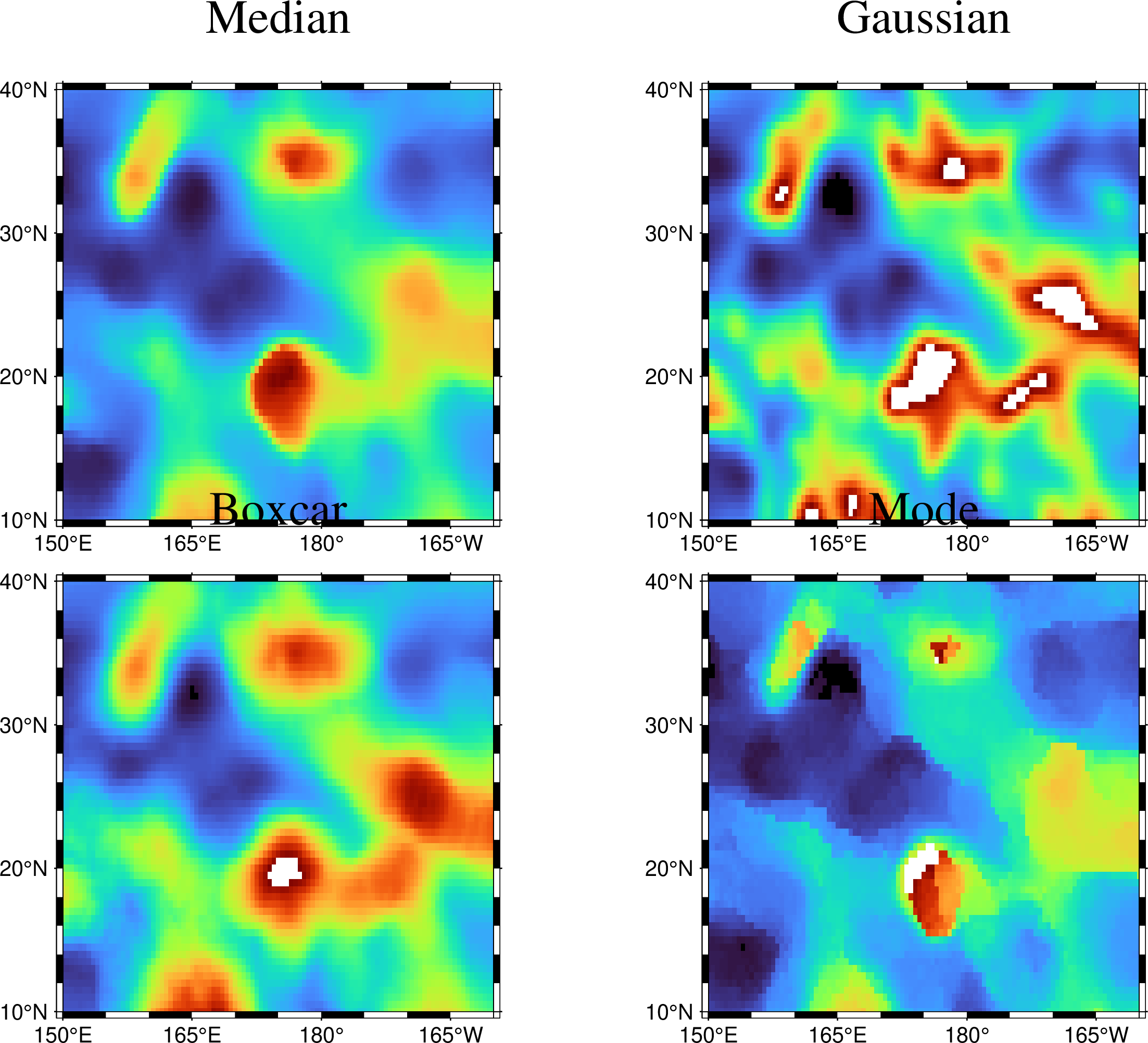 # 0.5 degree spacingG =grdfilter(grid, F="m600", D=4, I=0.5)# Different x and y spacingG =grdfilter(grid, filter="g100", D=4, inc="1/0.5")# 30 arc minutesG =grdfilter(grid, F="m600", D=4, I="30m")# 100 nodes in x, 50 in yG =grdfilter(grid, filter="g50", D=4, I="100+n/50+n")