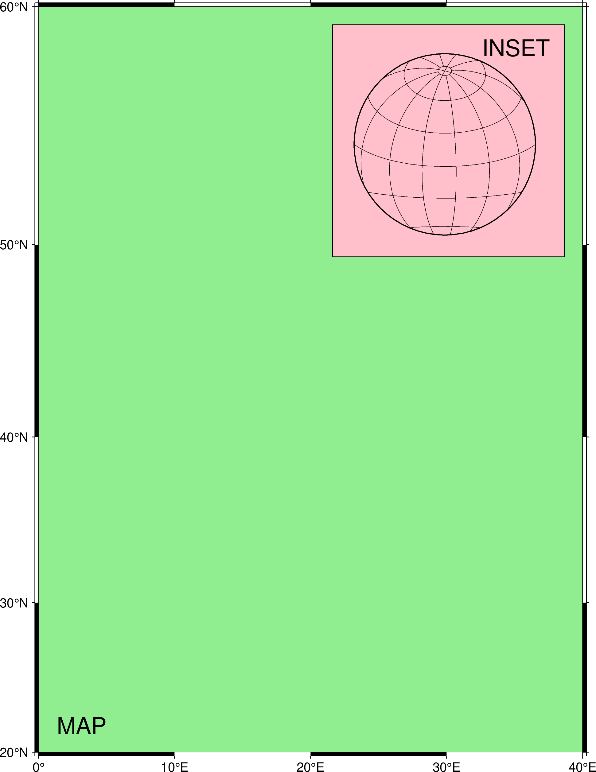 The inset(…) defines the dimension and placement of the inset canvas. It records the current region and projection so that we may return to the initial plot environment when the inset is completed. The user may select any plot region and projection once plotting in the inset, but if the first command uses a projection that leaves off the scale or width then we supply a scale or width to fill the inset as best as possible, given the inset size and margins (if selected). Note: If you wish to let the inset dimensions be determined by the region and projection that will be used to draw in the inset, then give these arguments in the inset() command.