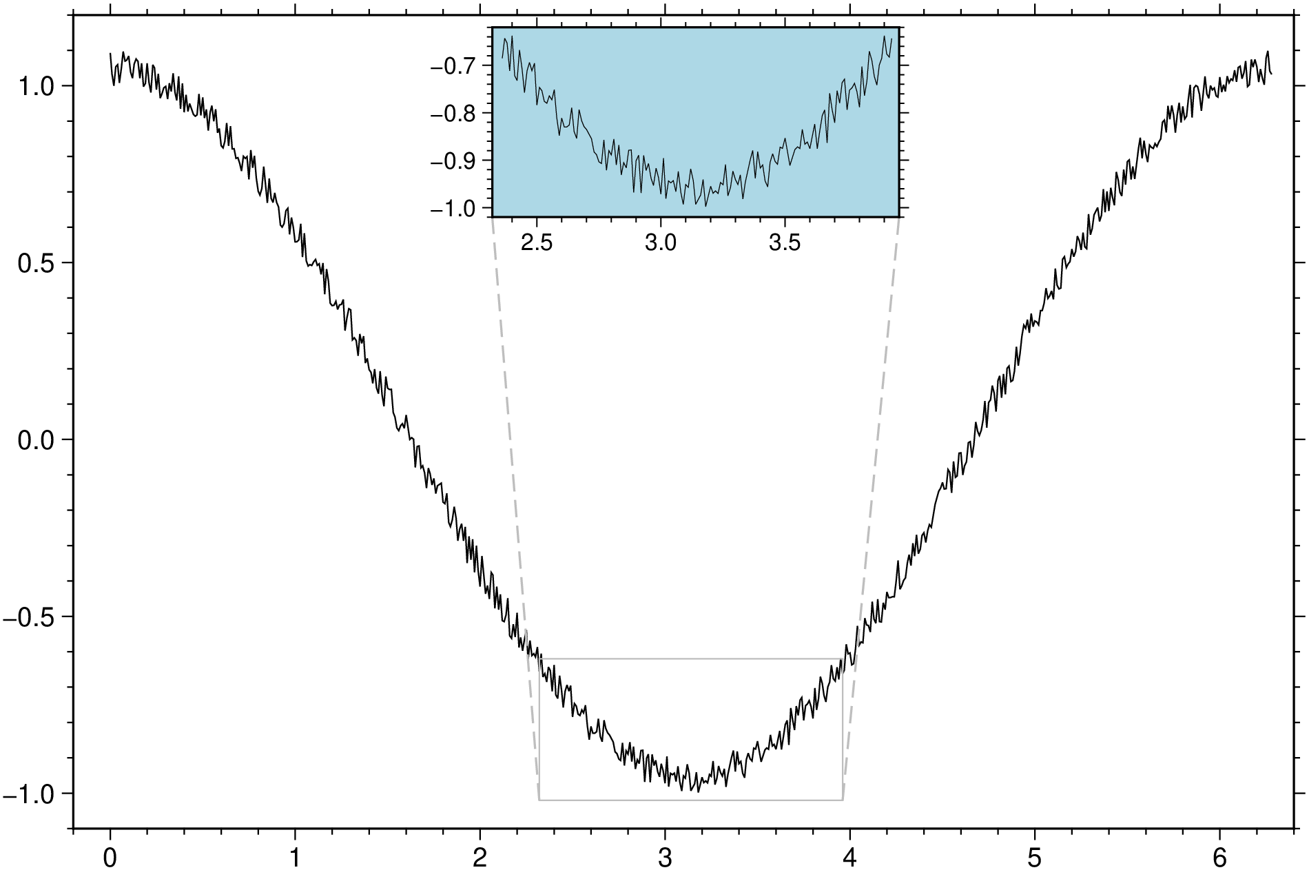 zoom This refers to an area of the main window that we wish to make a zoom of. Its arguments depend on whether we are zooming an x,y plot or an image. In the first case we pass an x location and a half-width. For example zoom=(10,2) means that the zoom window covers the abscissa [8 12] range. The y extent is whatever the line has between those x limits. But for the case of images we need one more argument because now we have 2 dimensions. The syntax now is zoom=(x0,y0,delta), an extension of the previous concept, which requires that the units of x and y are the same and we get a square zoom window. The alternative is to use the usual way of GMT specifying region limits. That is zoom=(x_min, x_max, y_min, y_max)