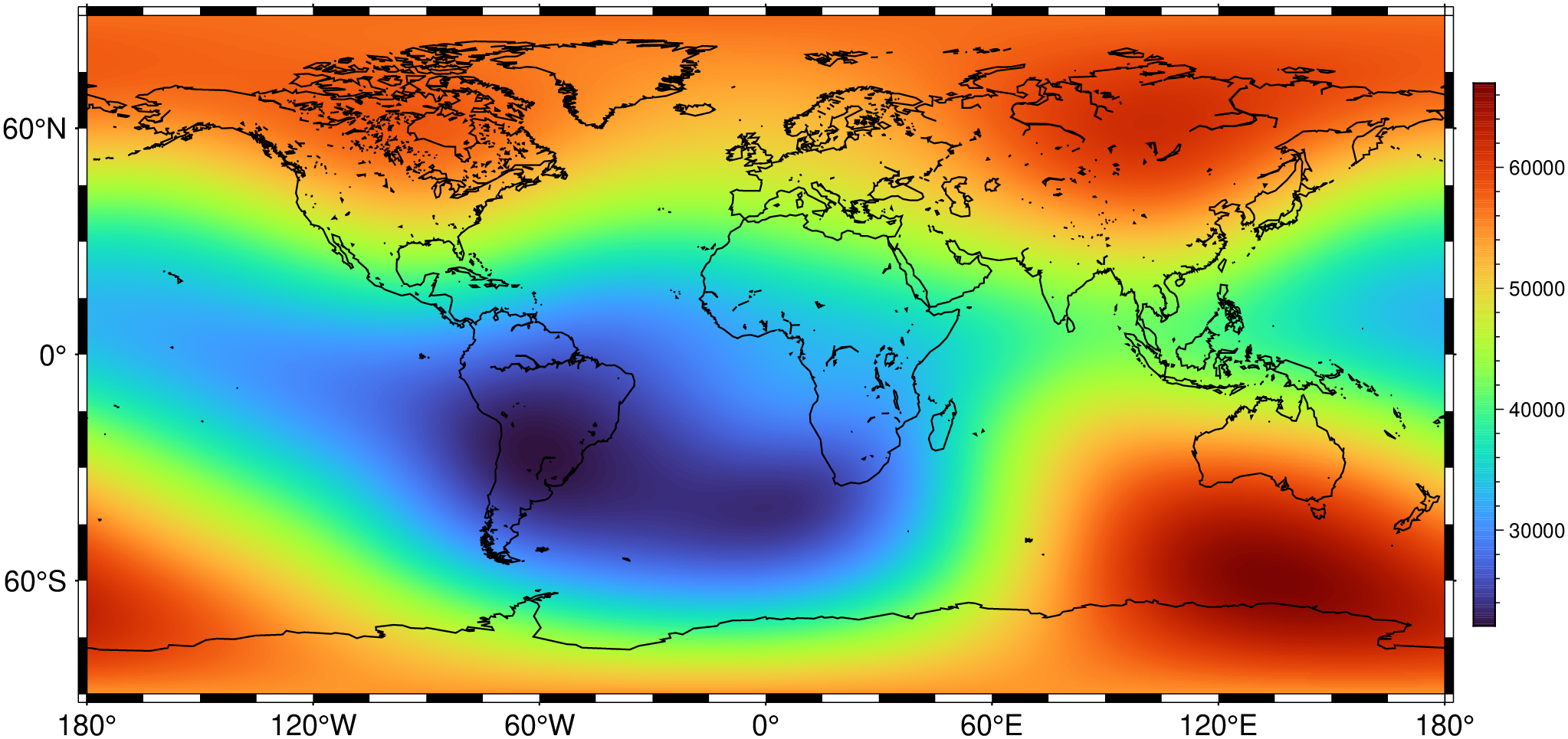 And to see the IGRF field at 2025.0. Since we are not specifying the grid increments (inc) it will assume a inc=0.25 degrees.