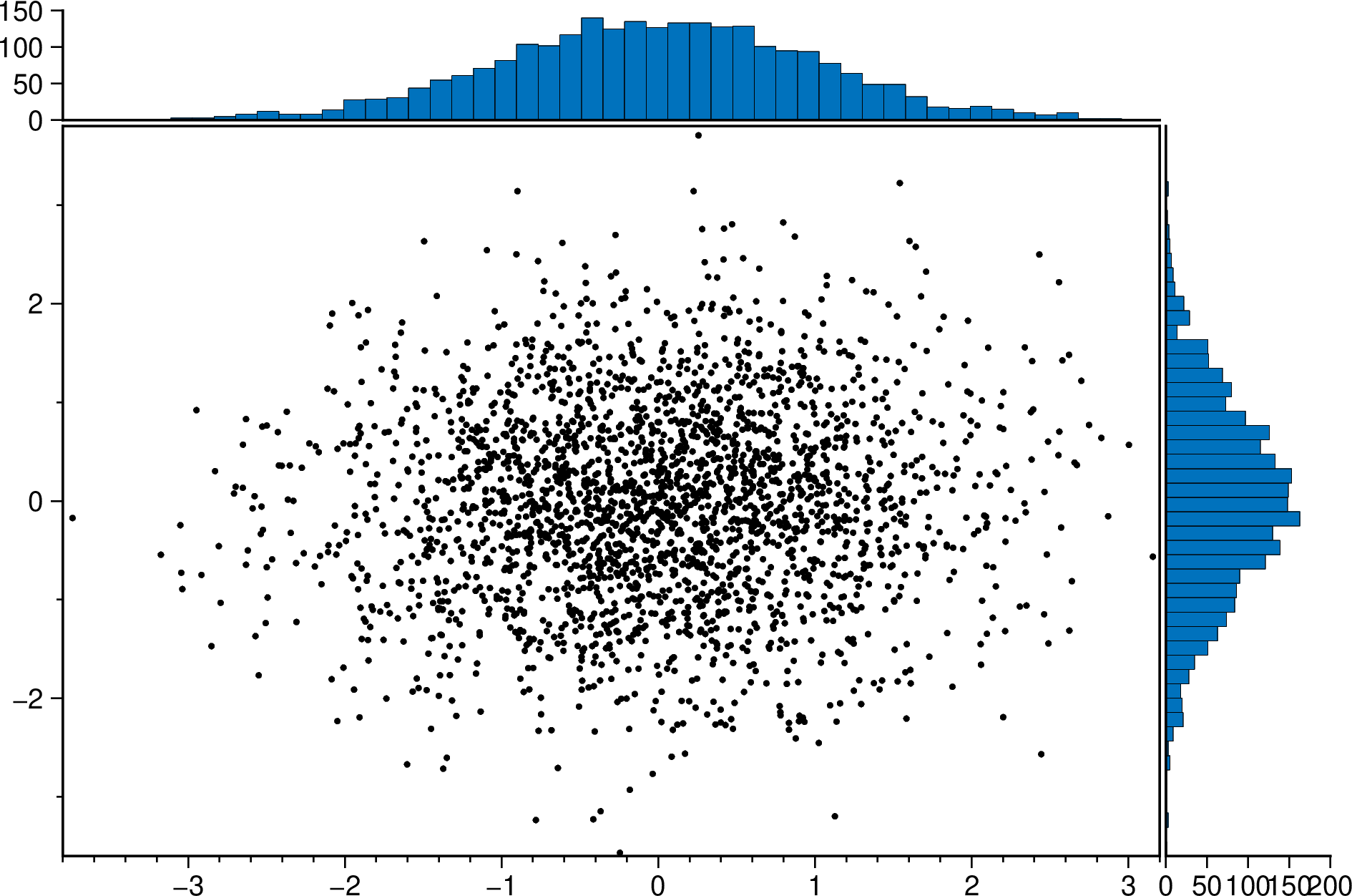 marginalhist(randn(2500,2), scatter=true, histkw=(annot=true,), show=true)