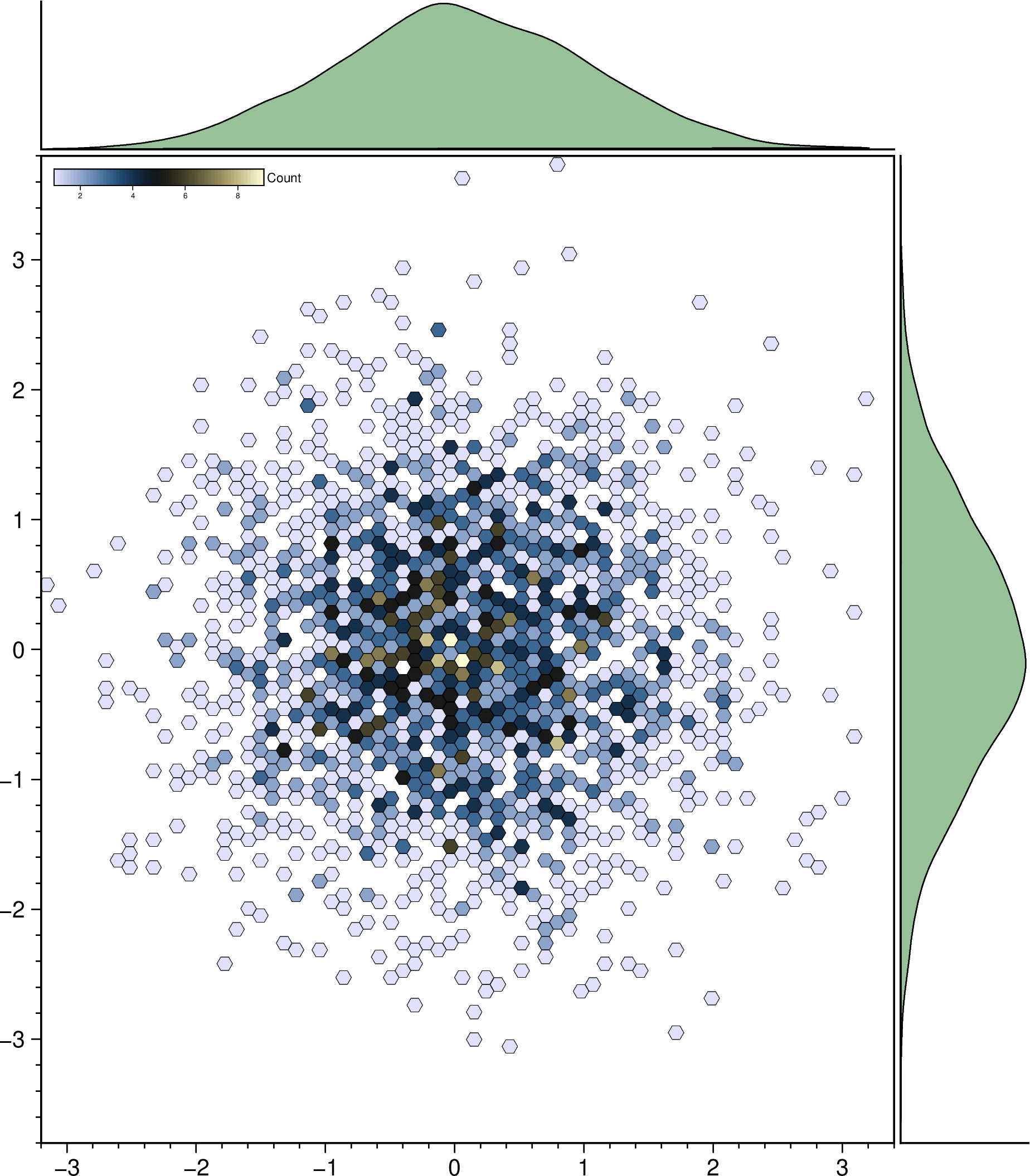 marginalhist(..., hexbin=true) Force hexbin plots even when number of points <= 2000. Default hexagon sizes are set via an heuristic rule but can be explicitly set via [binstats] options, Namely inc or nbins options. WARNING, this option requires that the scatter figure has dmensions with an aspect ratio of 1, which is not the case with the default figure size. To set fig dimensions with aspectratio = 1 use figsize="width/0" or set aspect=:equal. |