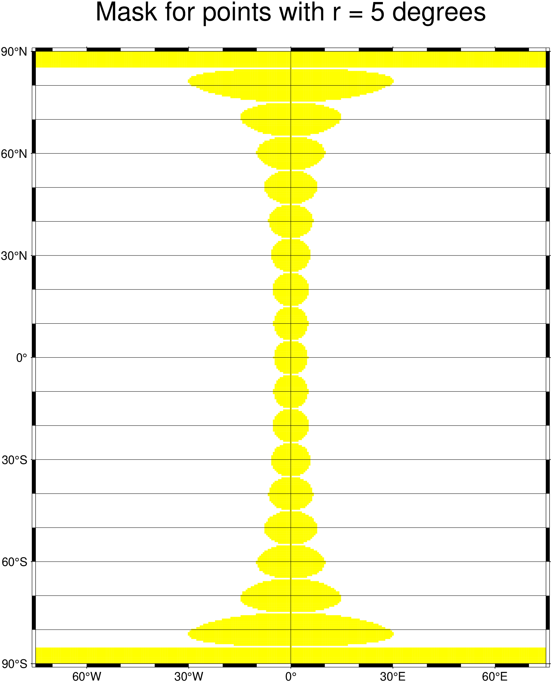 usingGMTt = [repeat([0],19) -90:10:90] # Some fake datamask(t, fill=:yellow, inc="30m", region=(-75,75,-90,90), proj=:eqc, search_radius="5d", tiles=true, title="Mask for points with r = 5 degrees", xaxis=(annot=:auto, ticks=:auto, grid=180), yaxis=(annot=:auto, ticks=:auto, grid=10), show=true)