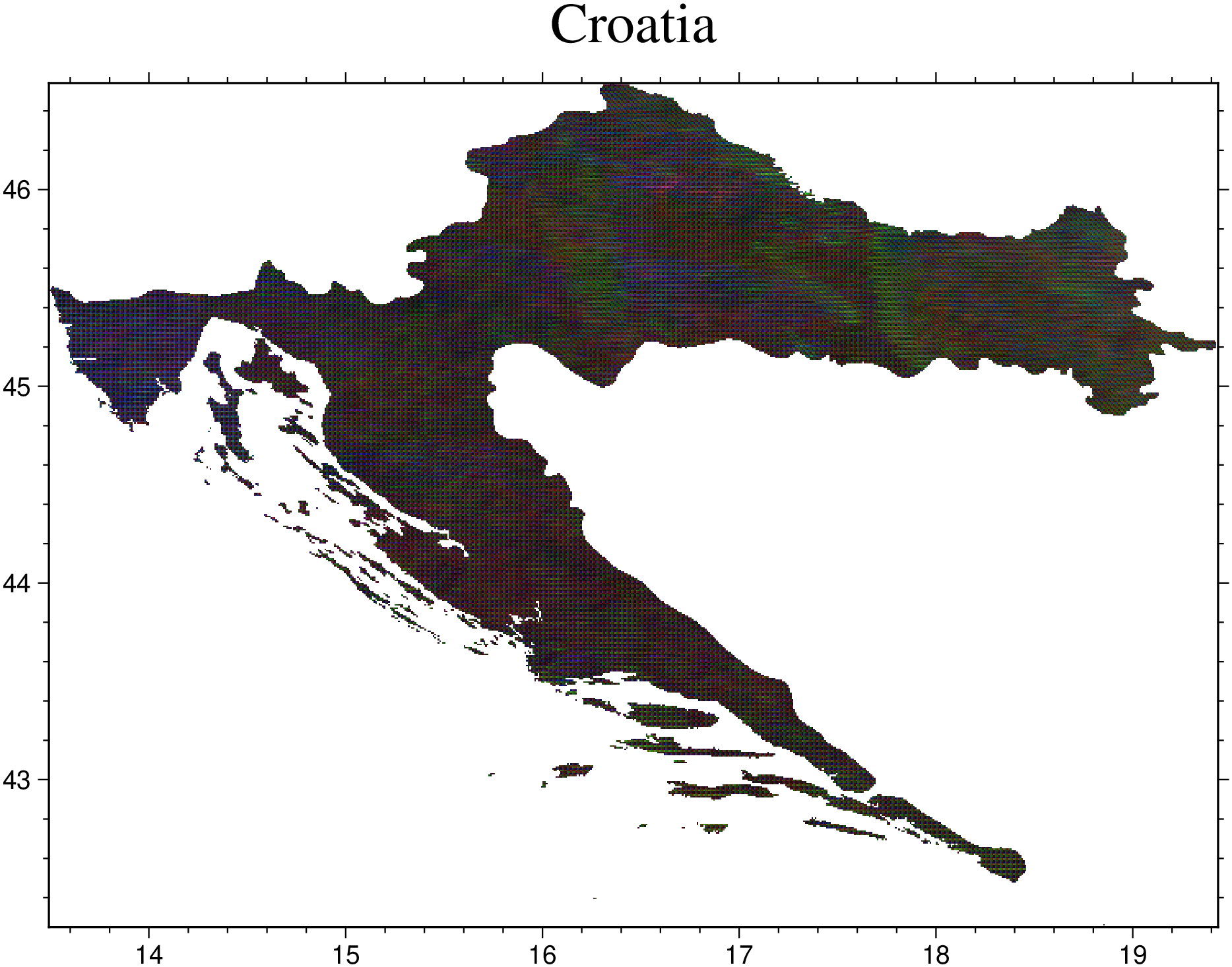 usingGMTD =coast(DCW=:HR, dump=true); # Extract the Croatia border from the DCWI =gmtread("@earth_day_30s", region=D, V=:q); # Load Earth image containing CroatiaIc =mask(I, D); # Mask outside (make image transparent there)gmtwrite("Ic.tiff", Ic) # For now we need to save and reload to seeIc =gmtread("Ic.tiff"); # the tranparency in action.viz(Ic, title="Croatia")