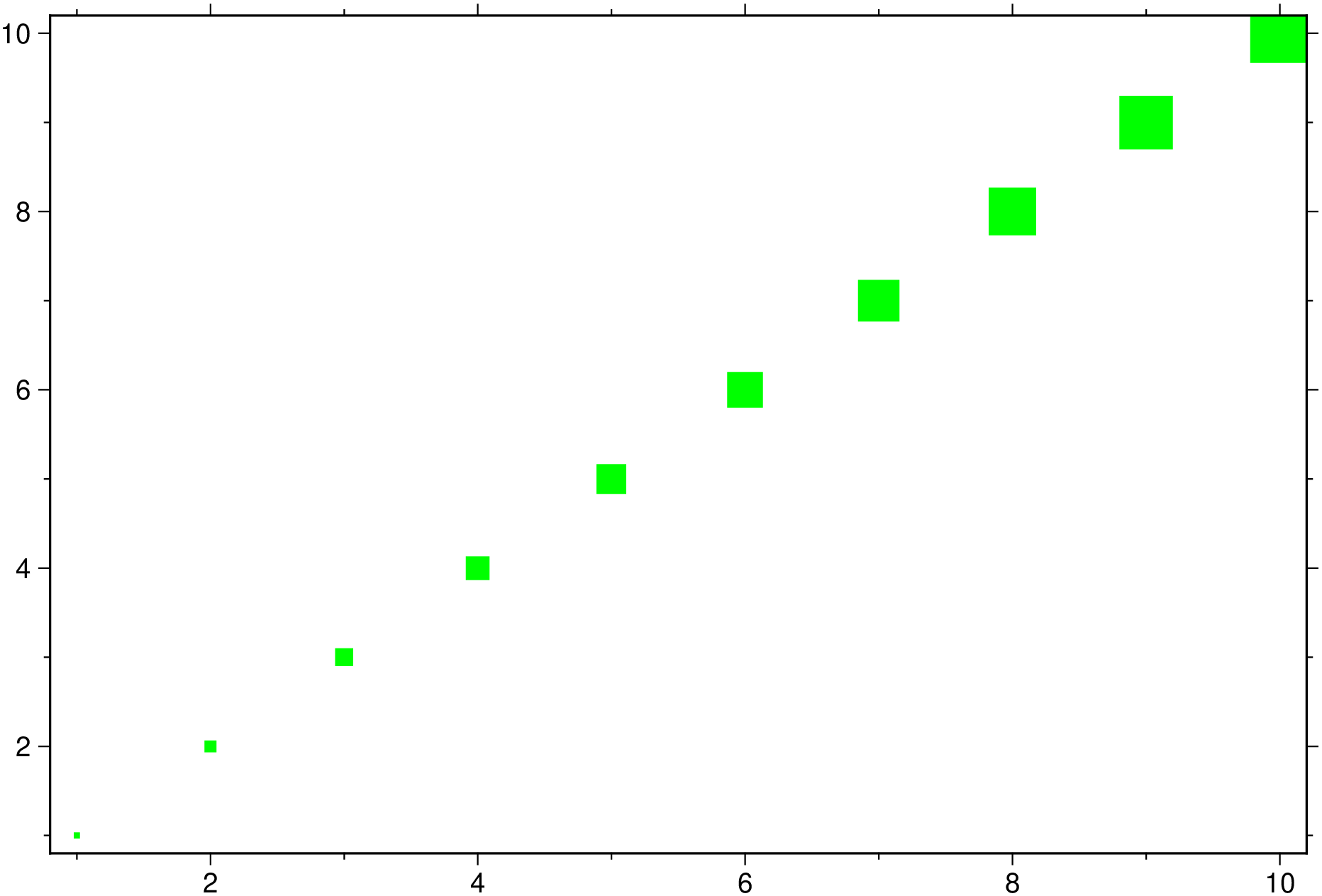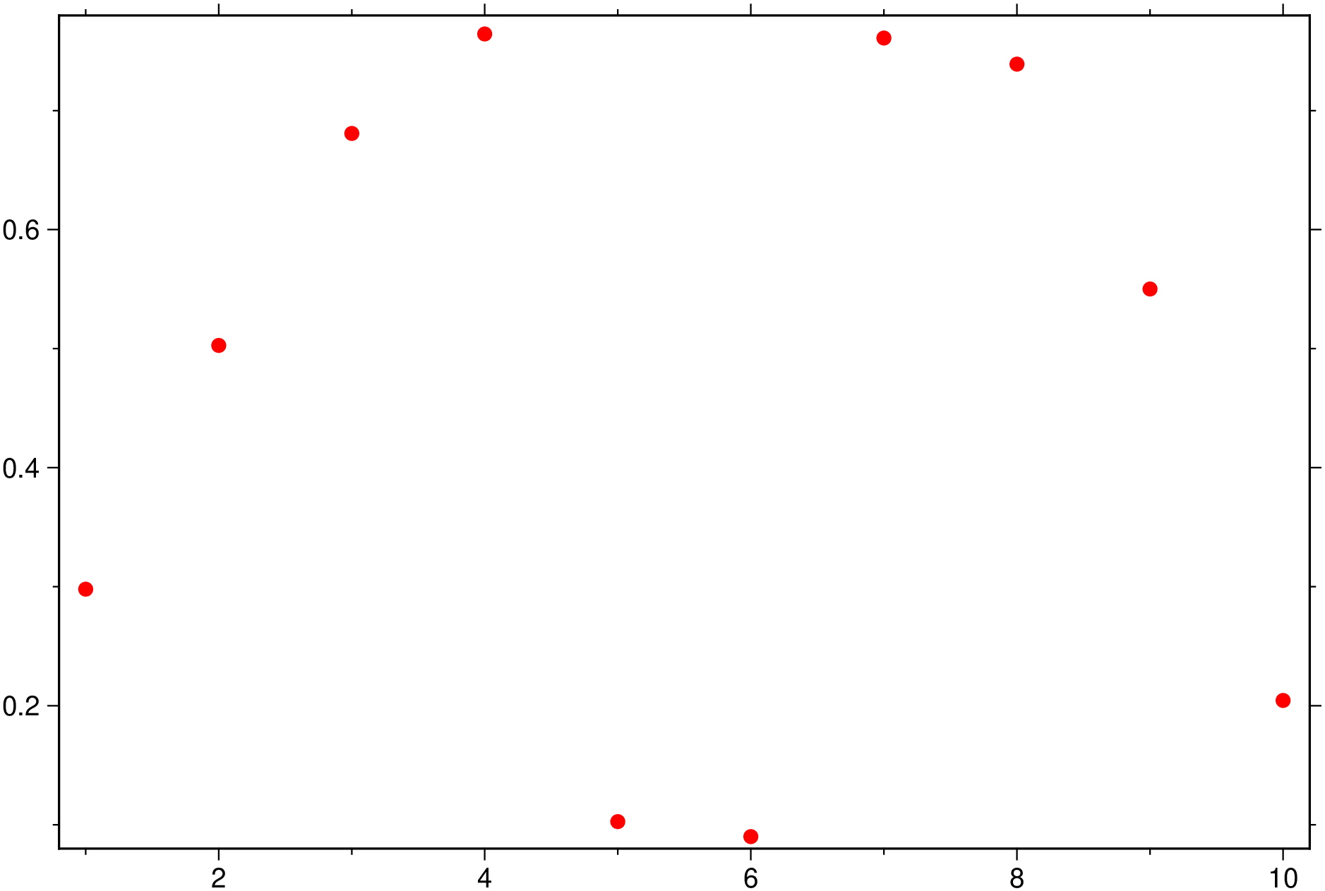 :circle, size is symbol size in cm, unless unit is specified i.e. :pointsIn alternative to the symbol keyword, user can select the symbol name with either marker or shape and symbol size with markersize or ms. The value of these keywords can be either numeric (symb meaning size in cm) or string if an unit is appended, e.g. markersize="5p" This form of symbol selection allows also to specify a variable symbol size. All it’s need for this is that the keyword’s value be an array with the same number of elements as the number of data points.