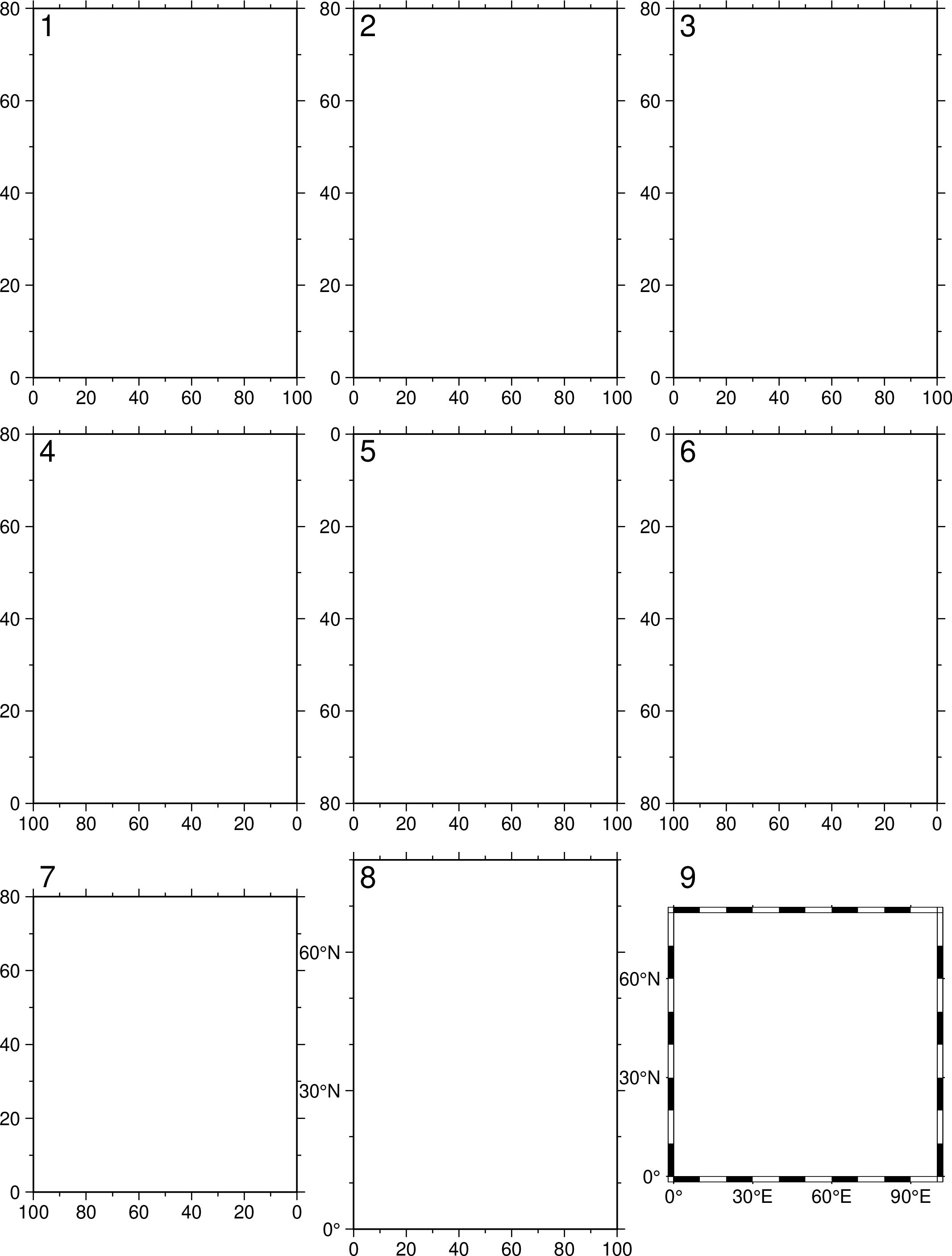 Optionally, you may draw the outline (outline=pen) or paint (fill=color) the figure rectangle behind the subplots, add dividing lines between panels (divlines=pen), and even expand it via clearance=(dx,dy). These are most useful if you supply axes=:none, meaning no ticks or annotations will take place in the subplots. See [Setting color] and [Pen attributes] for extend color and pen selections.
