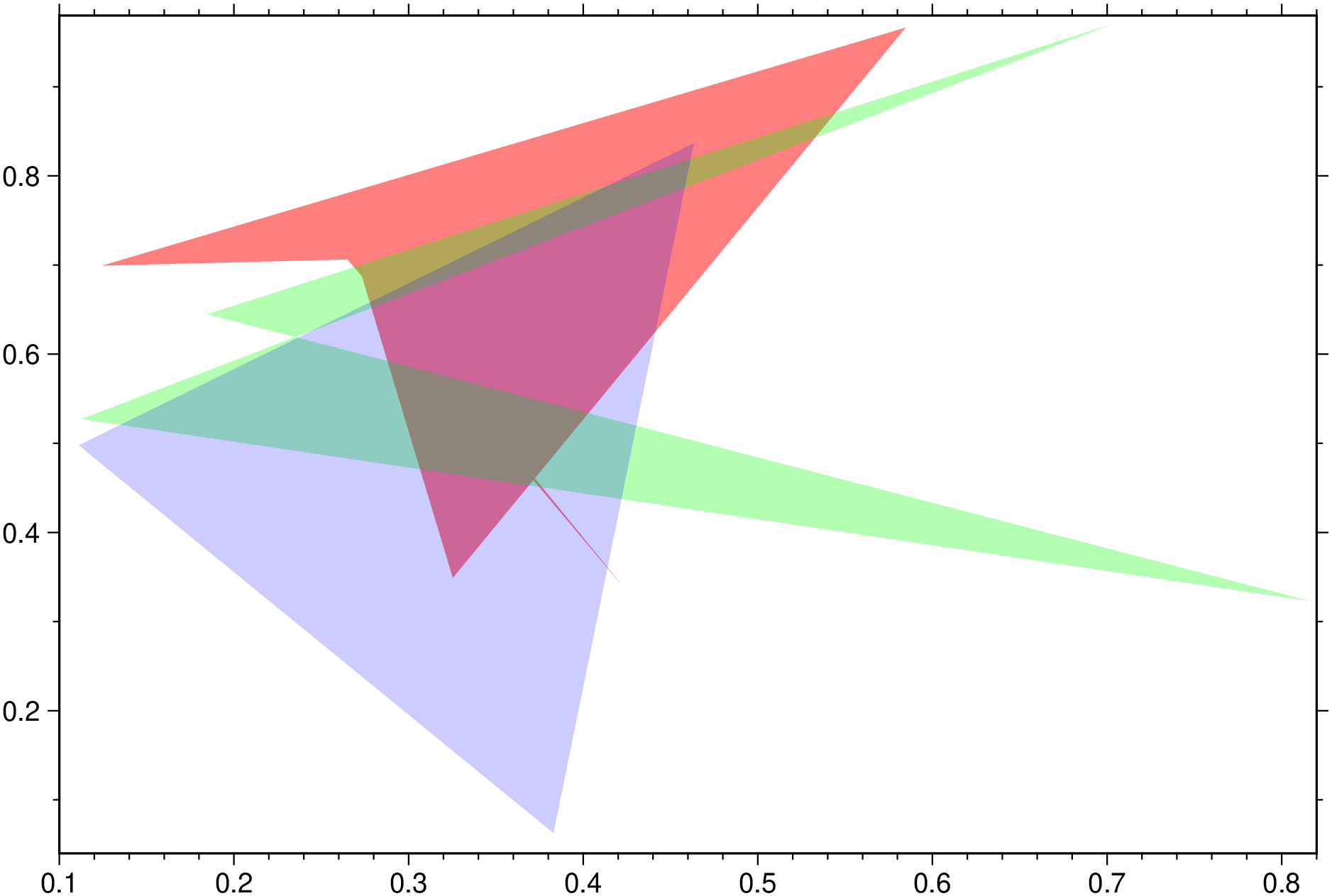 D = mat2ds([rand(6,3), rand(4,3), rand(3,3)], fill=[[:red], [:green], [:blue]], fillalpha=[0.5,0.7,0.8]);