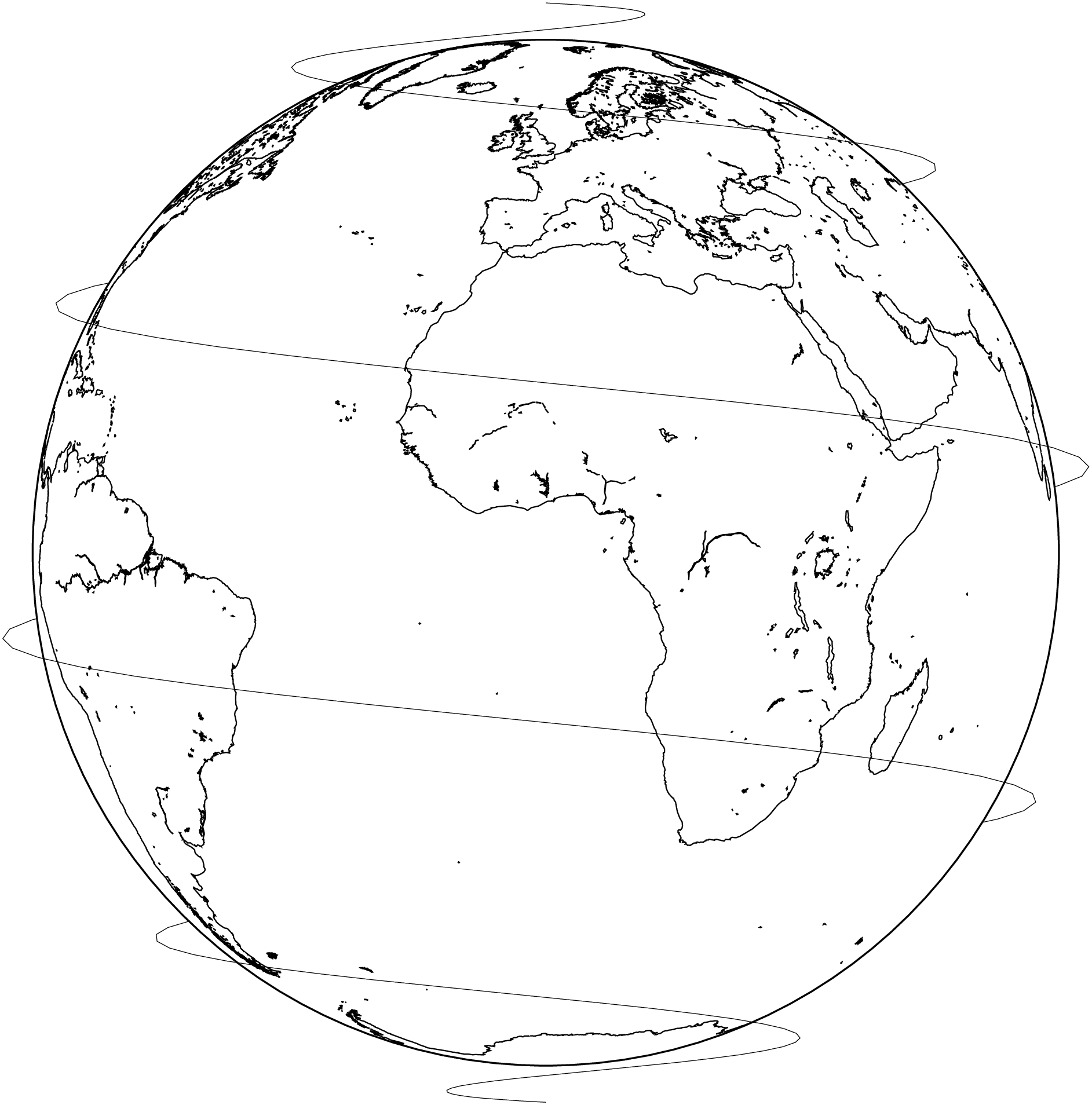first: Boolean that indicates if orbits creates the first layer of the image plot. If the default value of true is used, we also make a call to coast to plot the Earth using an Orthographic projection. The default option for this is plot the coastlines only, bur other options, e.g. colorizing the continents, are also available via the kw... arguments. Setting first=false, or better, use the orbits! form, skips the coast call, which lets this plot be appended to a previous plot as for example the one produced by grdimage on a Eart’s DEM. Note, however, that in this case the previous plot must have used the same lon0 and lat0 otherwise the visible orbit will be wrong.