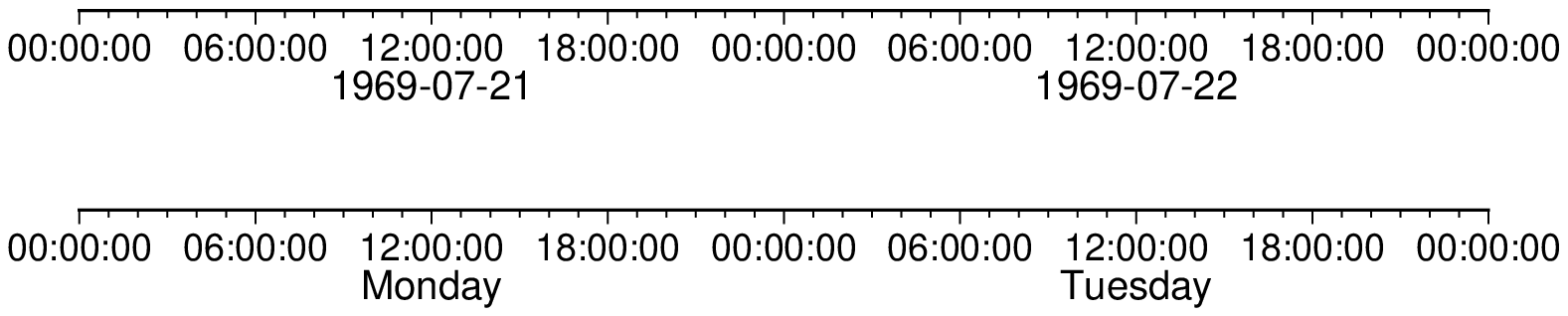 The next example shows two different ways to annotate an axis portraying 2 days in July 1969: