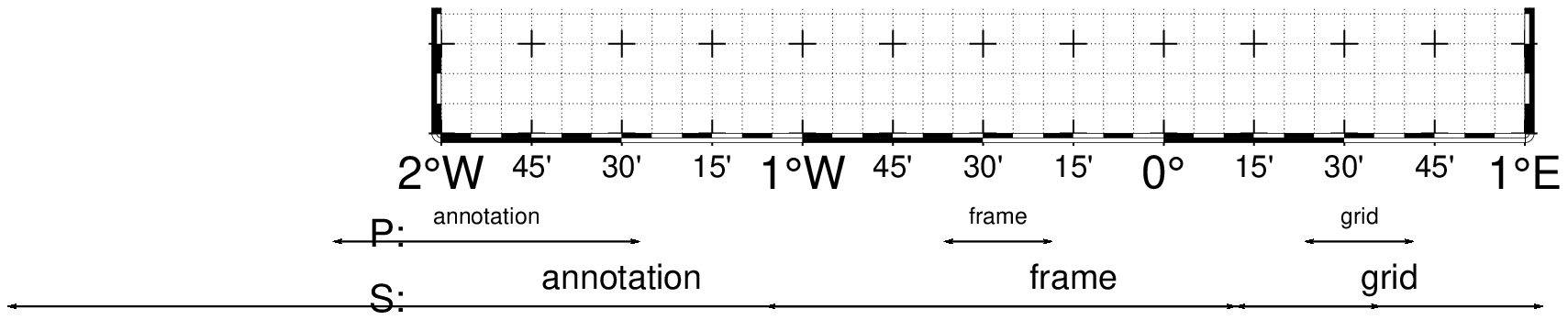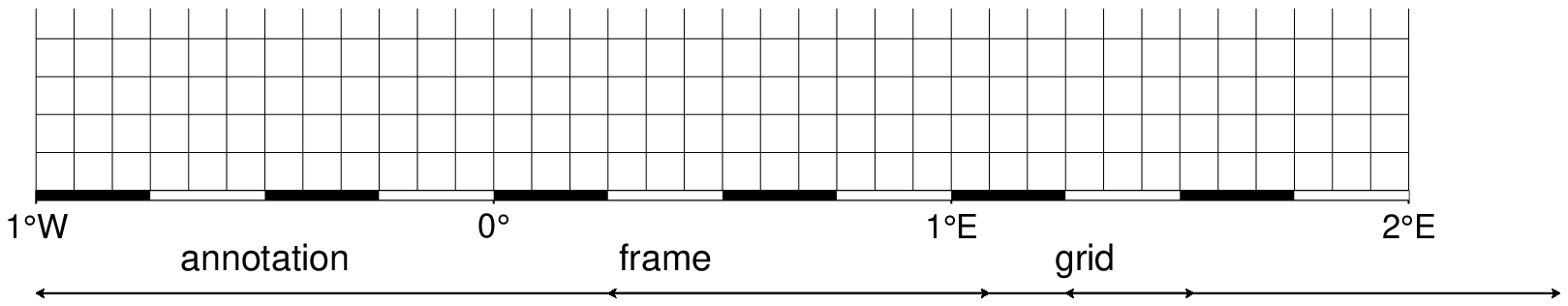 The machinery for primary and secondary annotations axes can be utilized for geographic base maps. This may be used to separate degree annotations from minutes- and seconds-annotations. For a more complicated base map example using several sets of intervals, including different intervals and pen attributes for grid lines and grid crosses.