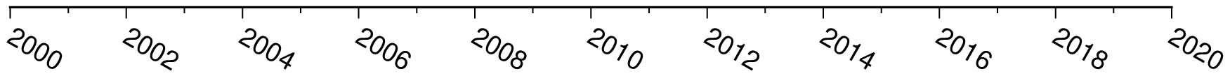 basemap(region=(2000,2020,35,45), frame=(axes=:S, annot=2, ticks=:auto, slanted=-30), show=true)
