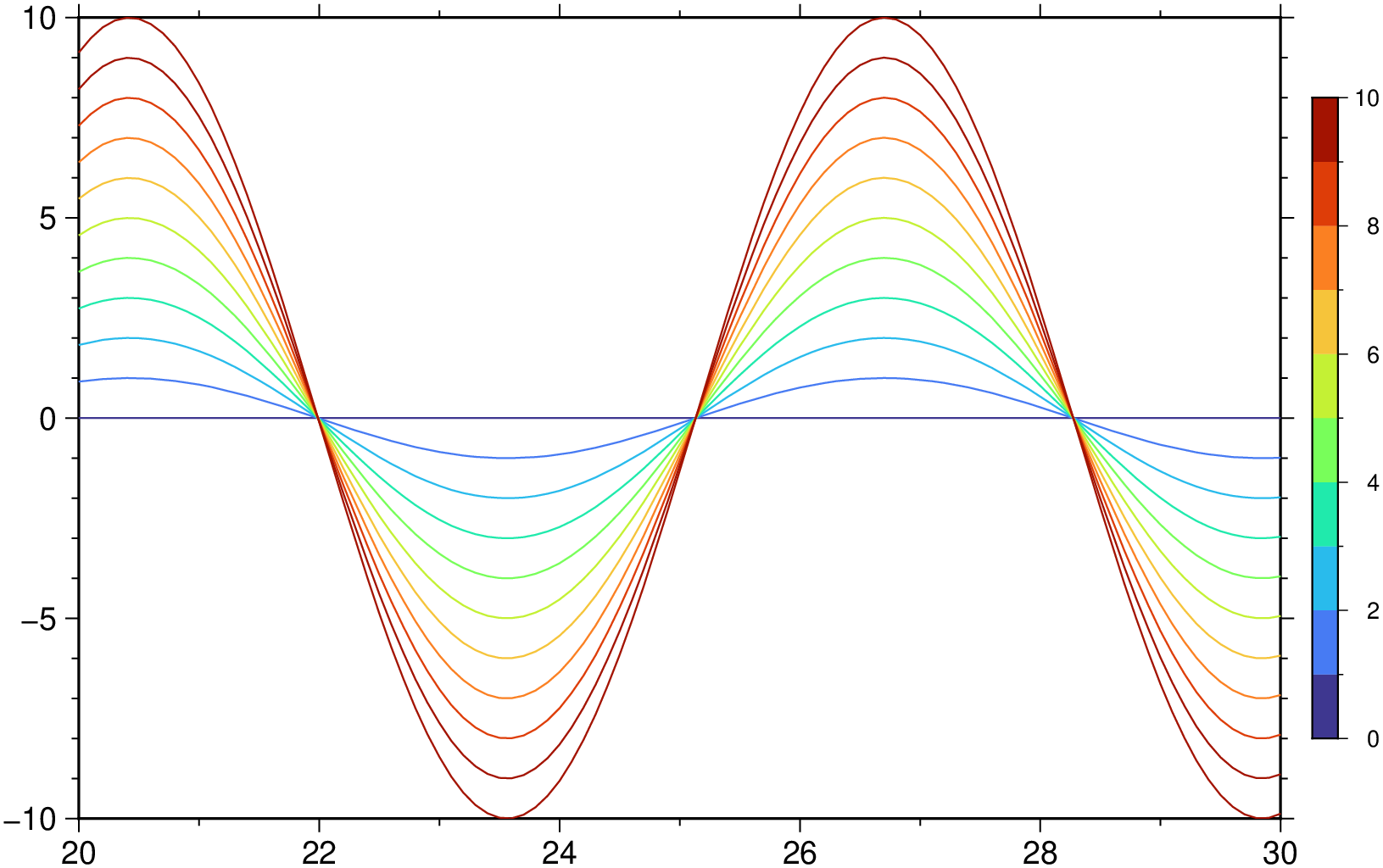 Normally we don’t need to start a figure with a call to basemap because the plot function takes care of guessing reasonable defaults, but in this case we start with a curve with small amplitude and we grow the figure by adding more lines. So if we leave it to automatic guessing one would have to start by the largest amplitude curve.