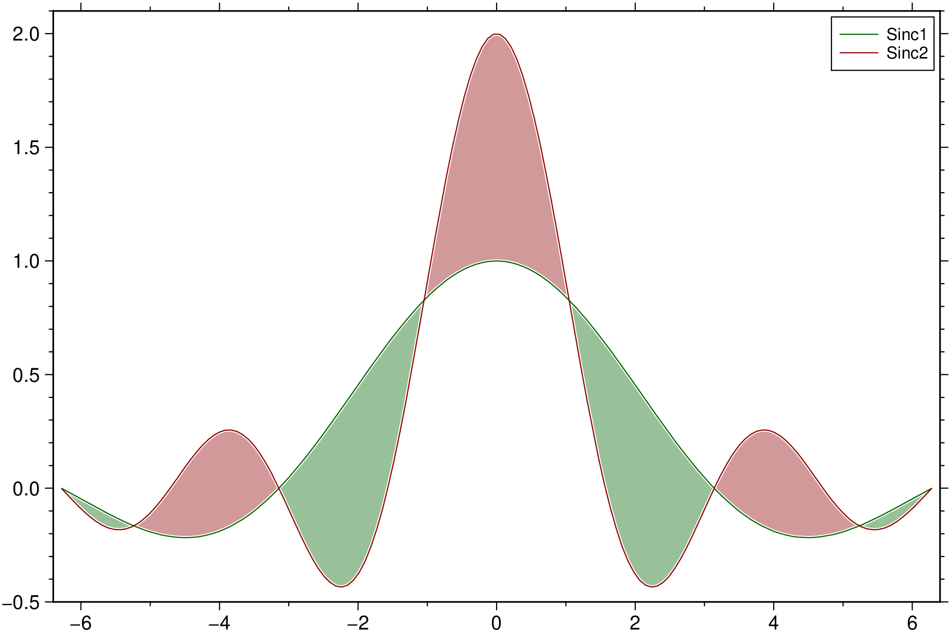 Fill the area between the two sinc functions. Here we use the default values for line thickness and fill color but all of that can be changed. We also add a thin white border arround tke lines.