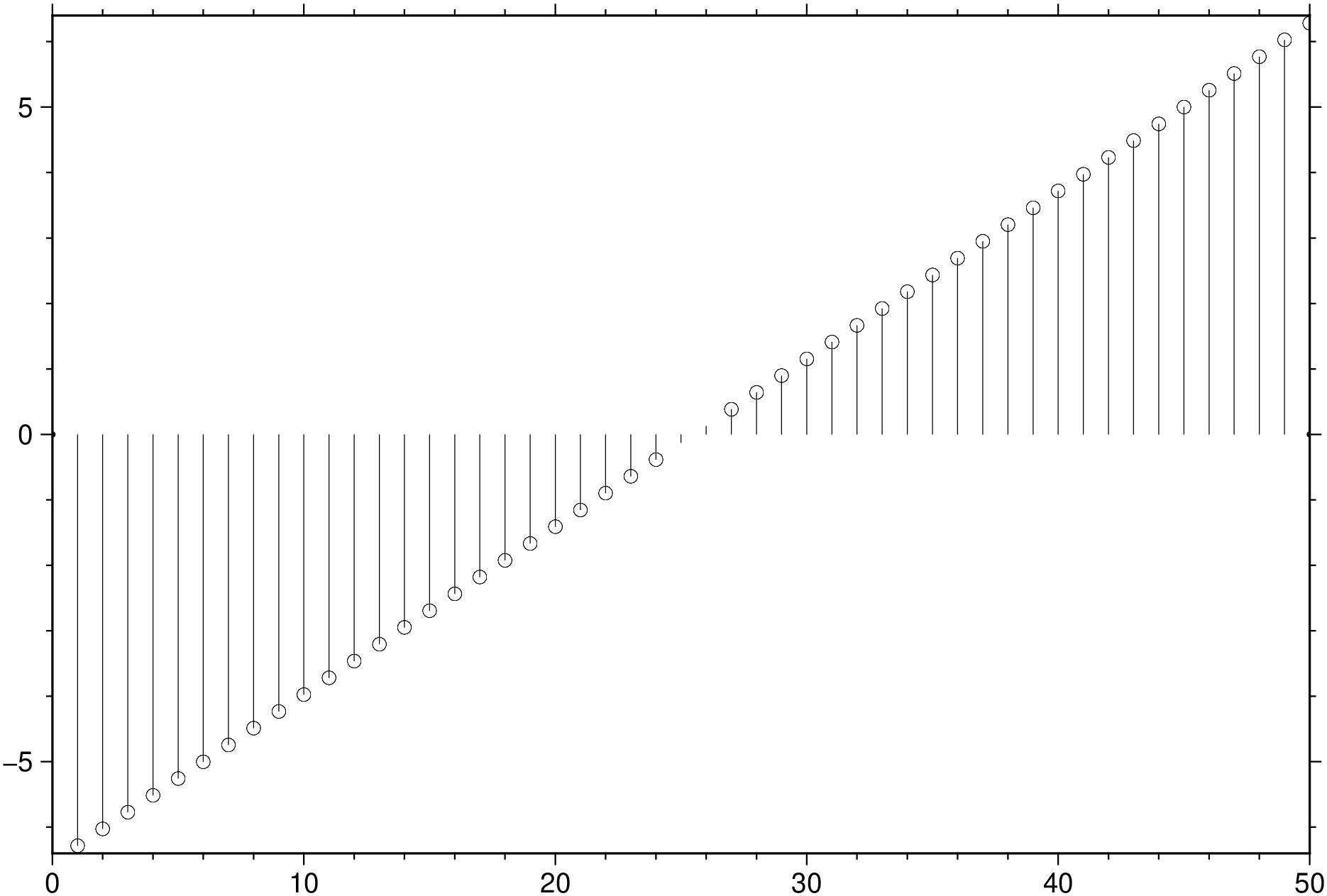 using GMT Y = linspace(-2*pi,2*pi,50); stem(Y, show=true)