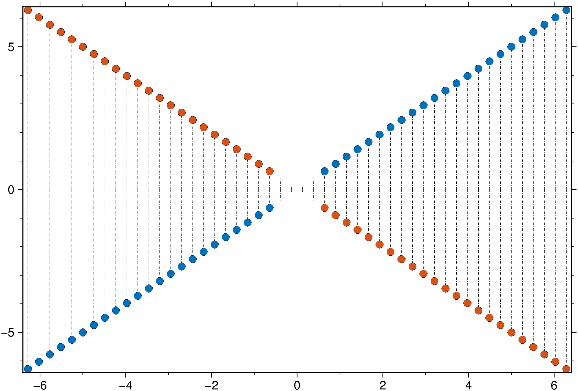 using GMT Y = linspace(-2*pi,2*pi,50); stem(Y,[Y -Y], multicol=true, fill=true, ms="10p", nobaseline=true, ls=:DashDot, show=true)