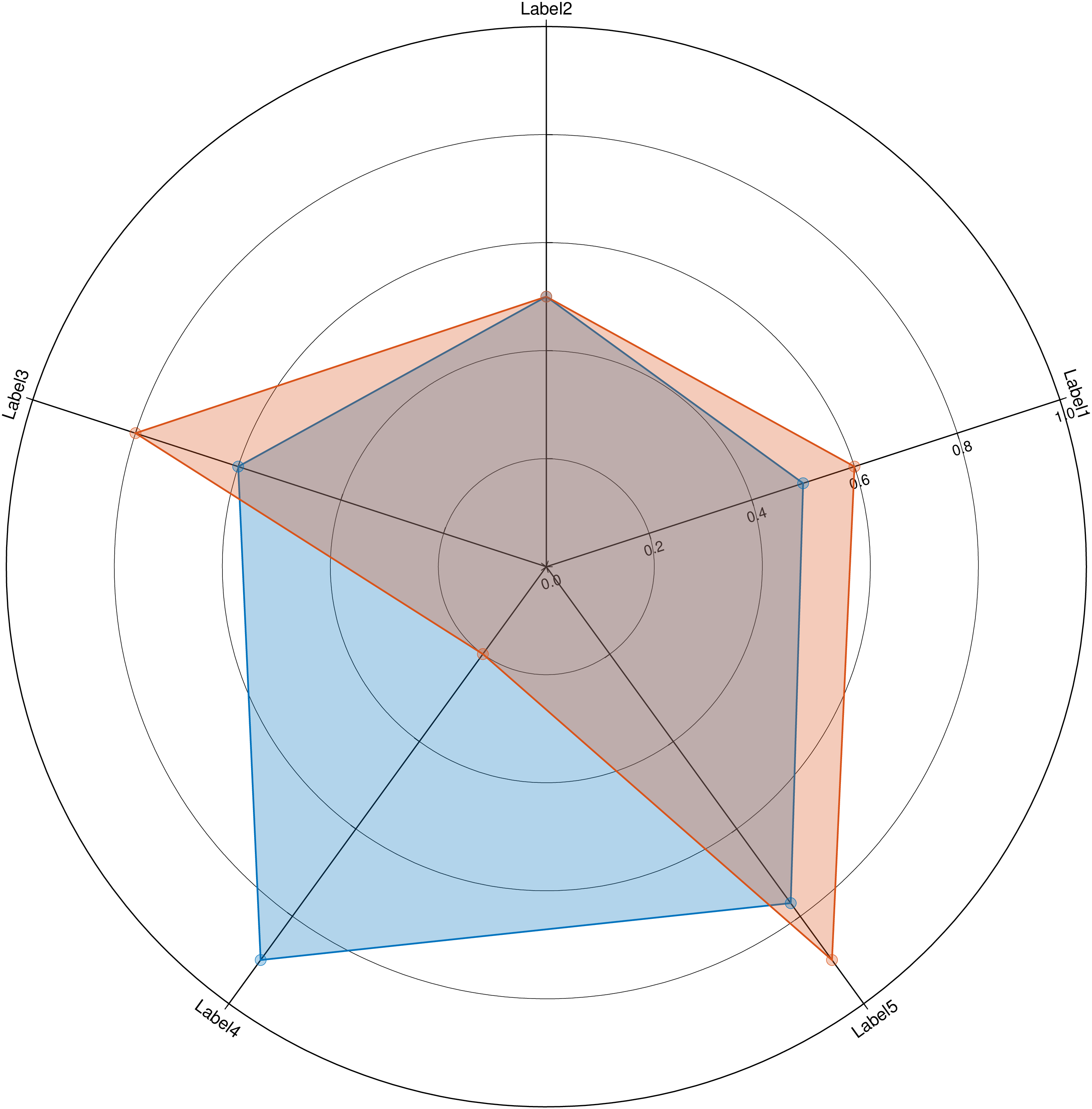 radar([0.5 0.5 0.6 0.9 0.77; 0.6 0.5 0.8 0.2 0.9], marker=:circ, fill=true, show=true)