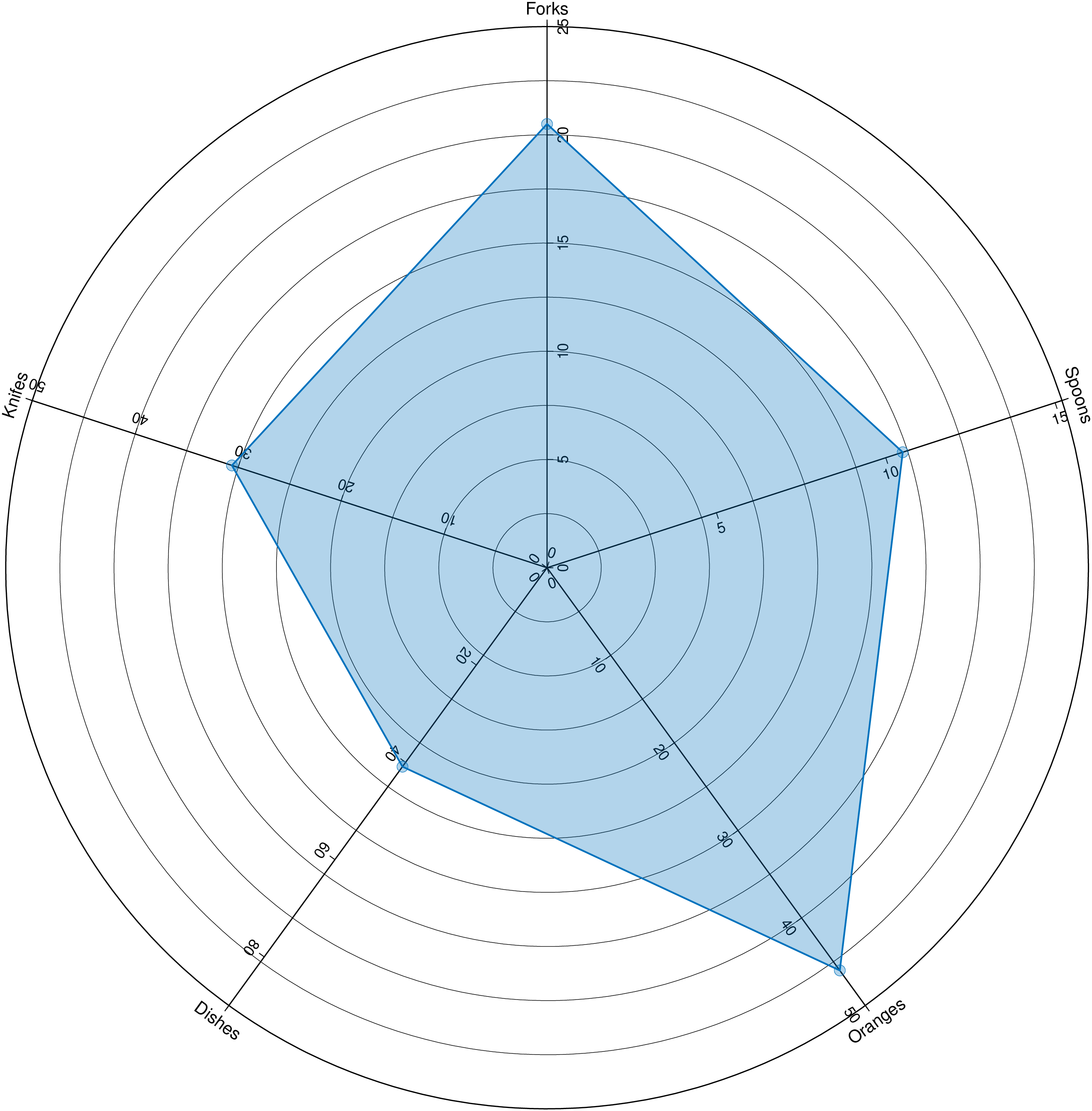 A radar plot with two datasets (a polygon for each). This example uses normalized coordinates so it shows the coordinates of only one axis.