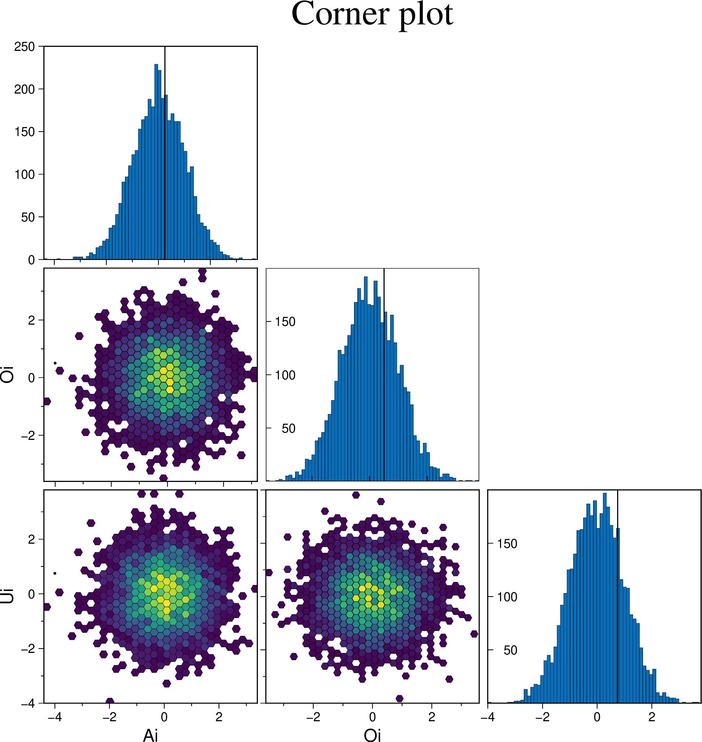 Create a cornerplot plot with hexagonal bins, setting the color map, the vriable names, plot truth and title.