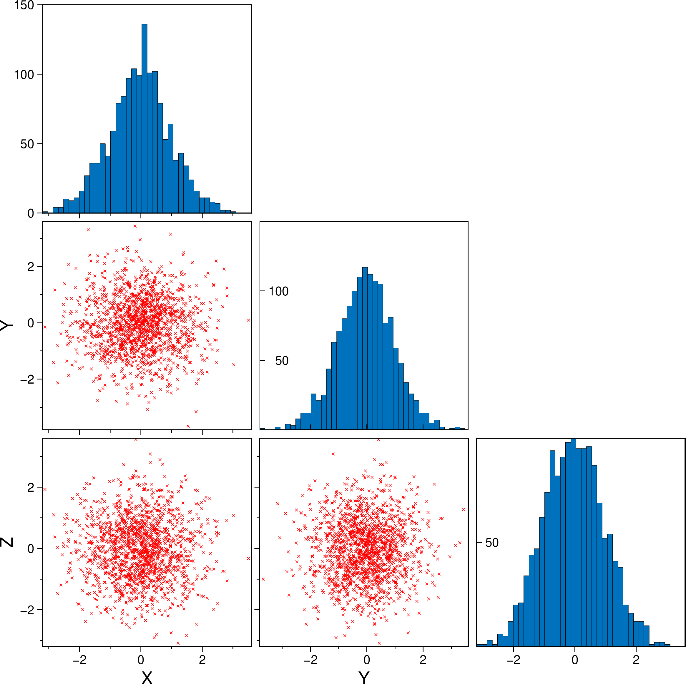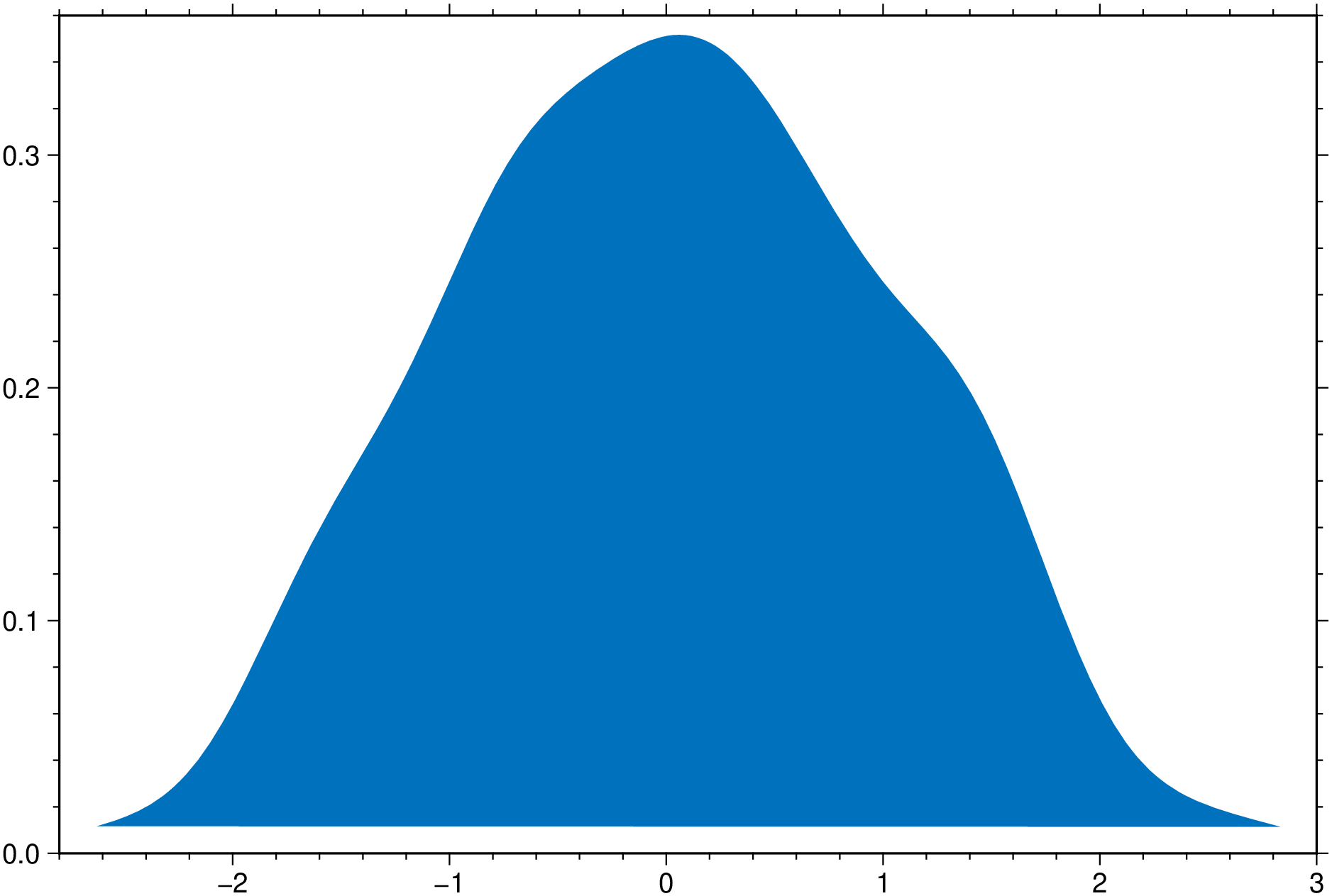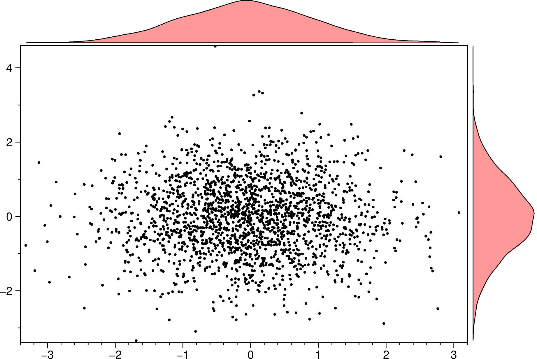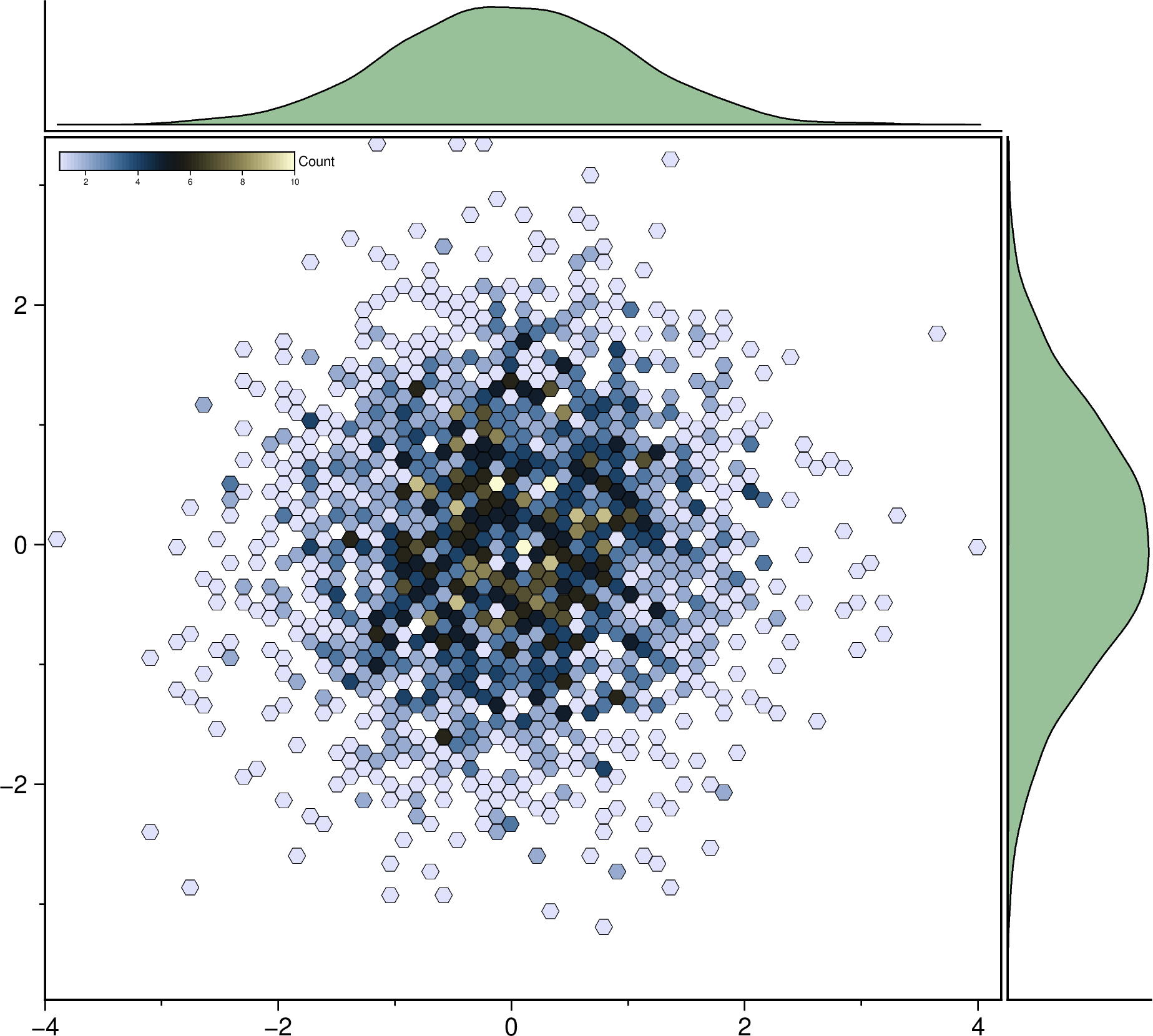 An hexbin scater plot with marginal density plots. Note that we must set aspect=:equal to have that hexbin plot.