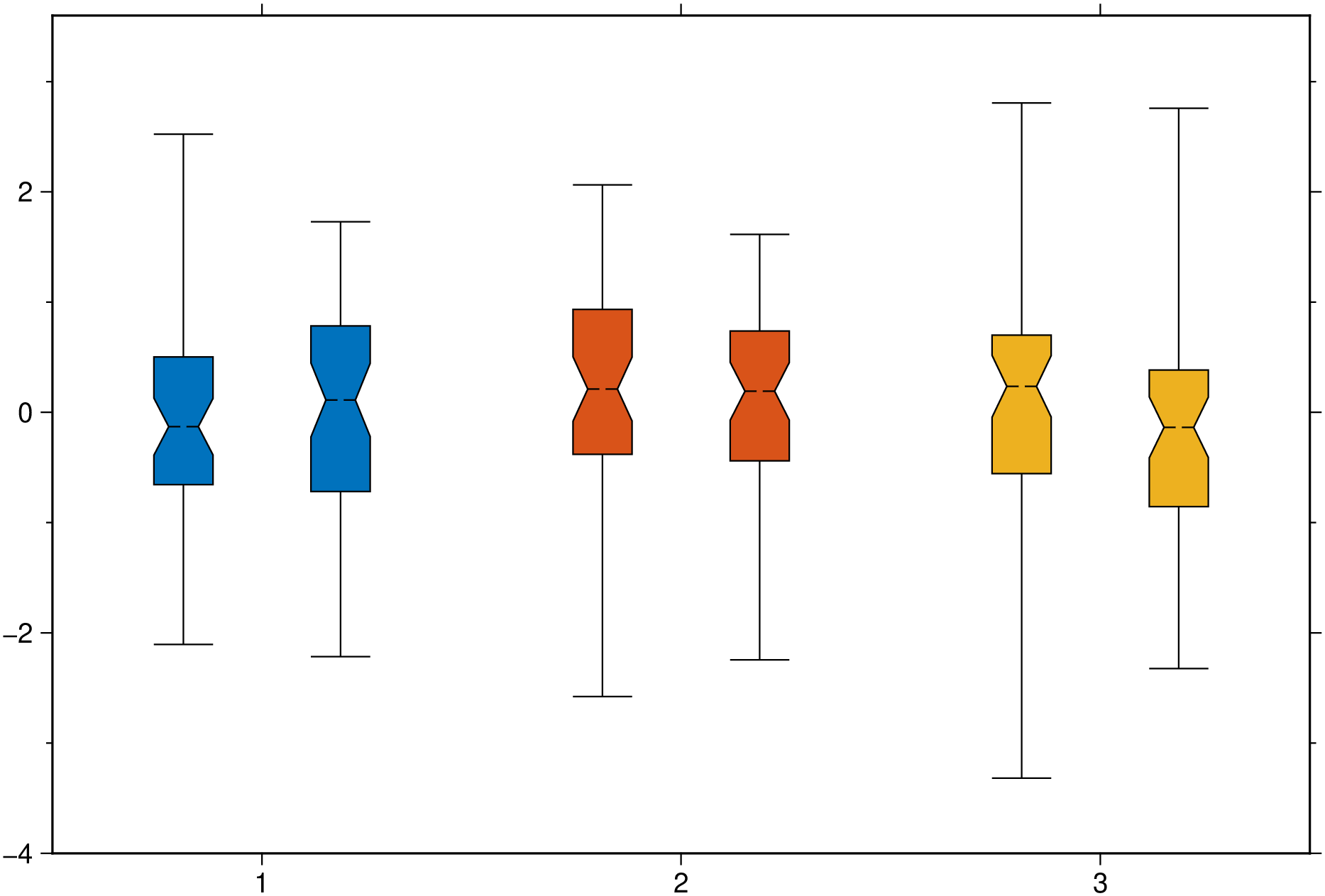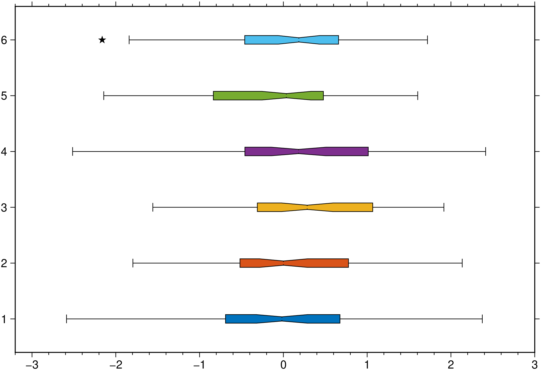 An horizontal boxplot with default colors, displaying outliers as 6p black stars. Noches are also shown but this requires GMT6.5.