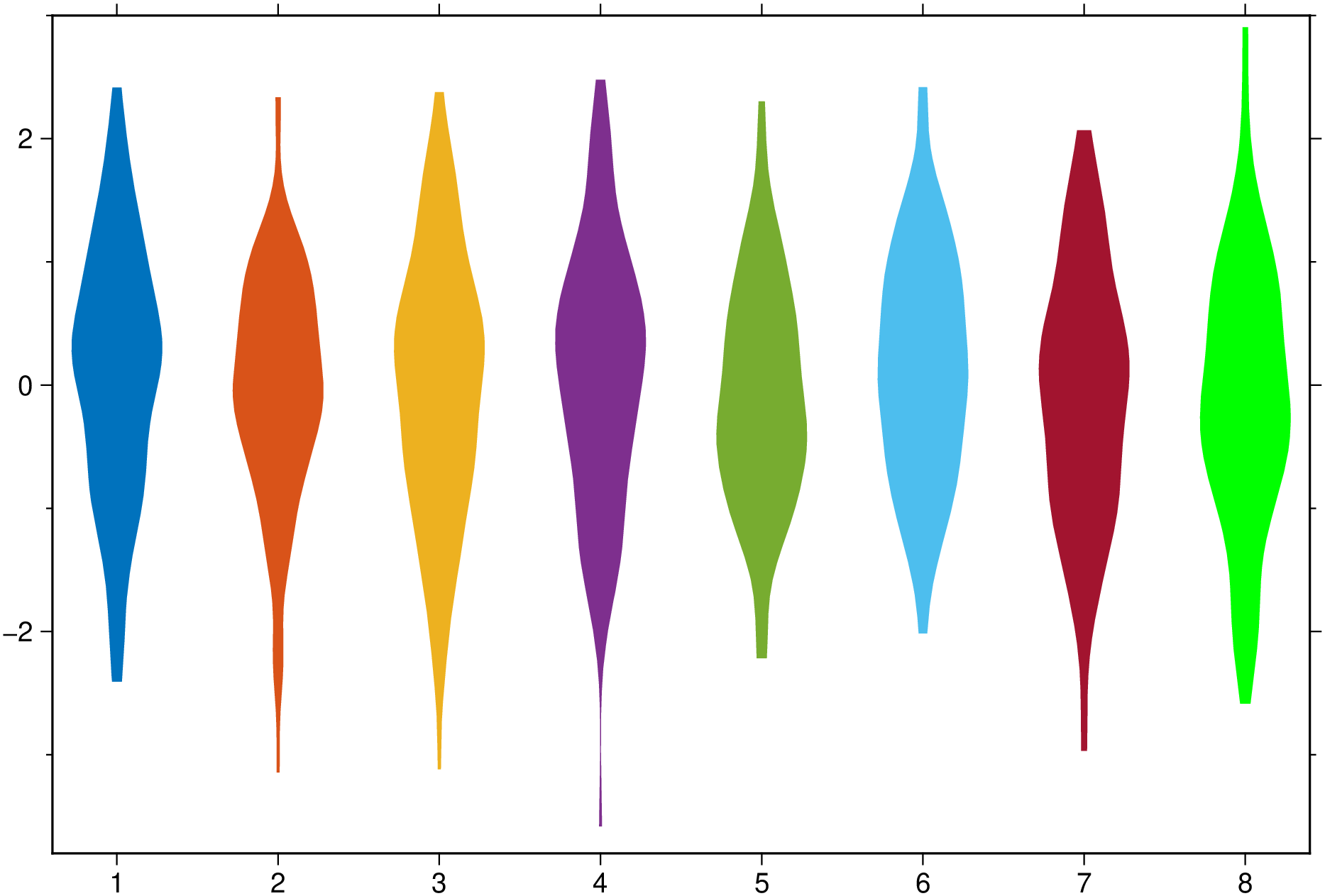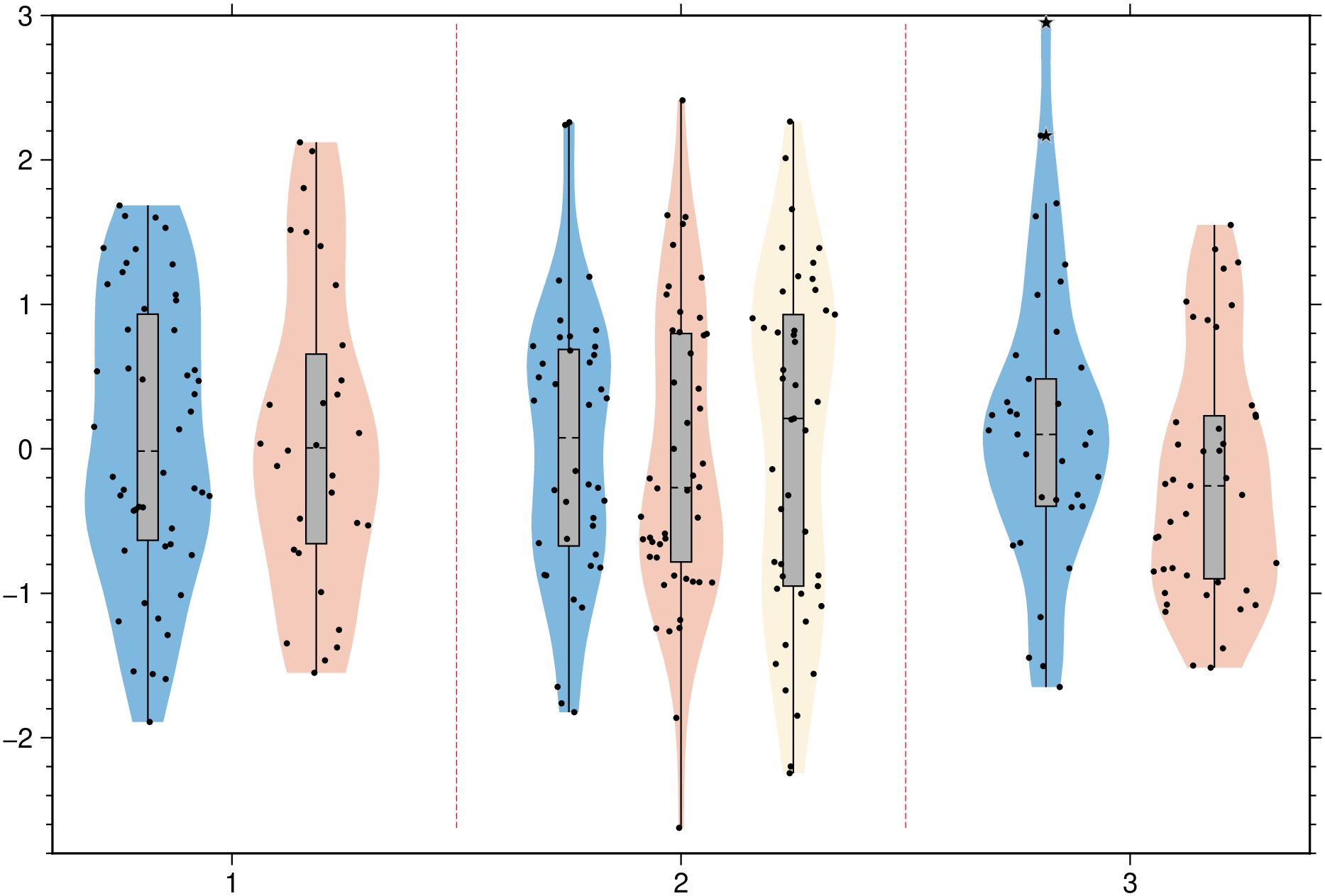 And a group example with red dashed separator lines and variable level of transparency for each element in the group. Note that this case uses input data as a Vector{Vector{Vector}}, which more representative of a real case as each violin is allowed to be made of a different number of observations.
