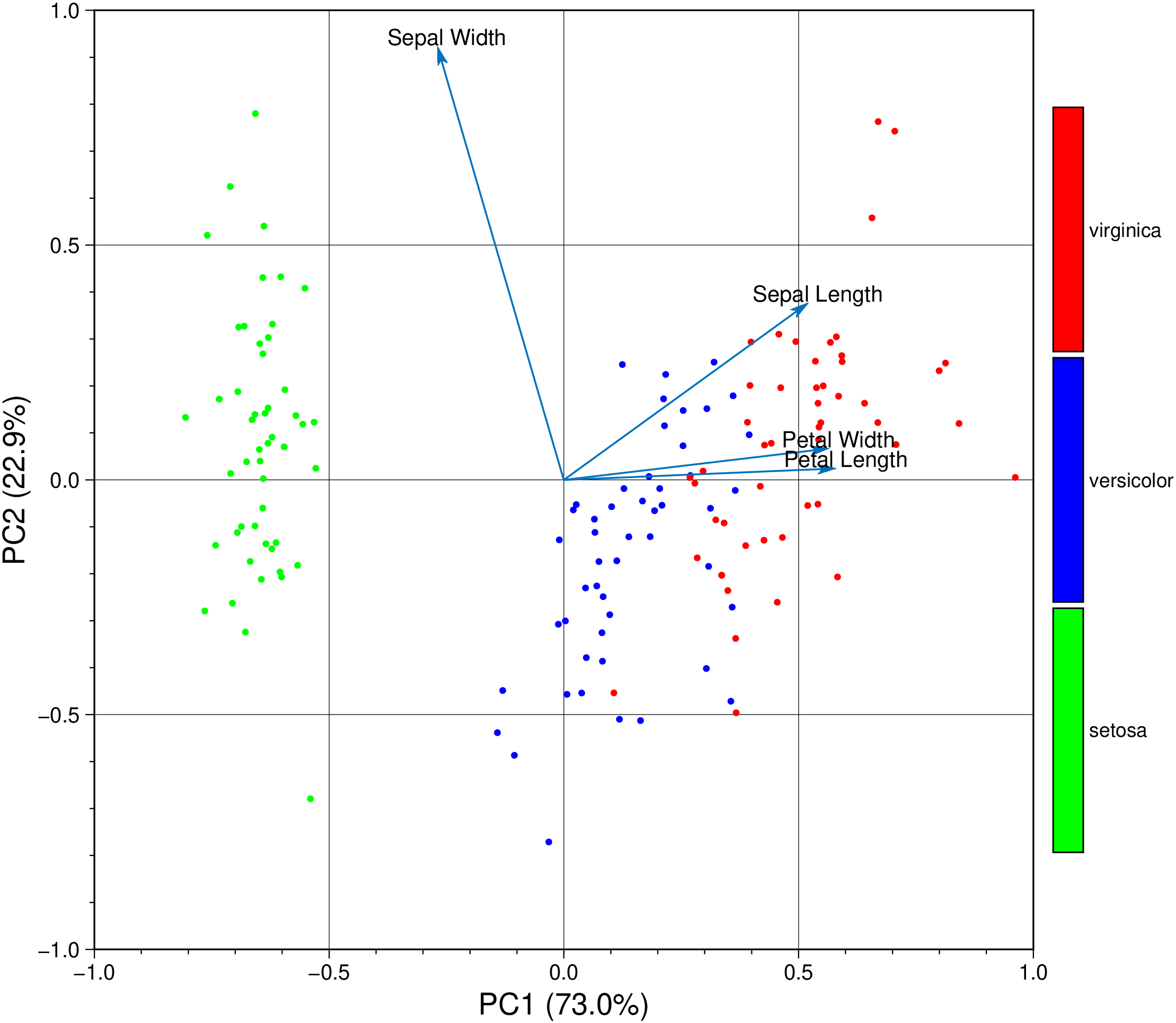 using GMT biplot(TESTSDIR * "iris.dat", show=true)
