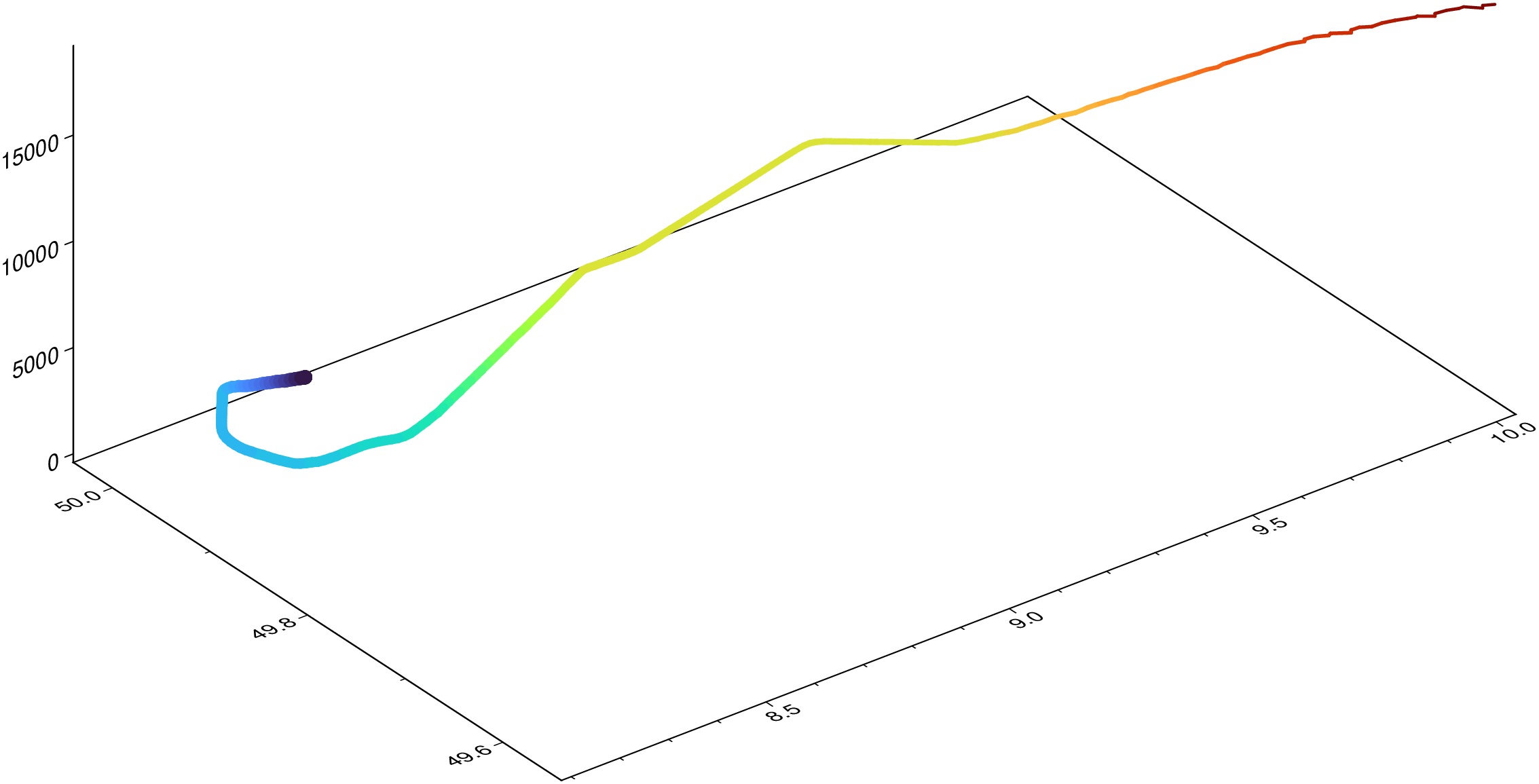 using GMT D = gmtread(TESTSDIR * "assets/track_sample_data.txt", incols="7,6,3"); plot3d(D, lc=:gradient, lt=[1,5], par=(PS_LINE_CAP="round",), show=true)