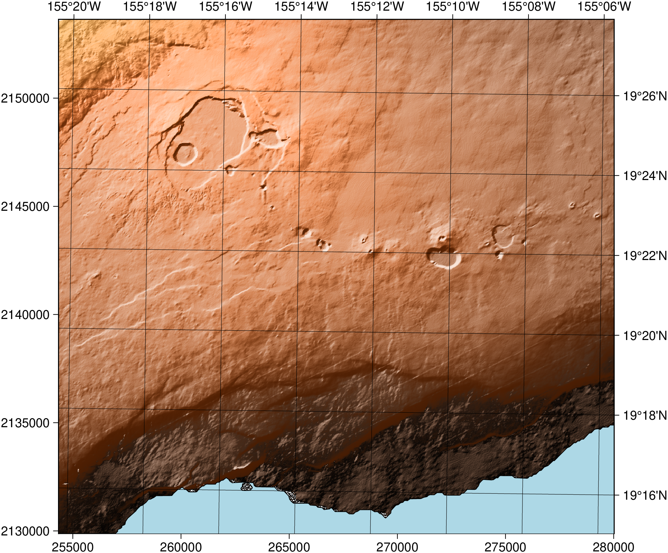 coast=(shore=true, ocean=:lightblue, frame=(axes="EN", annot=true, grid=true)), show=true)
